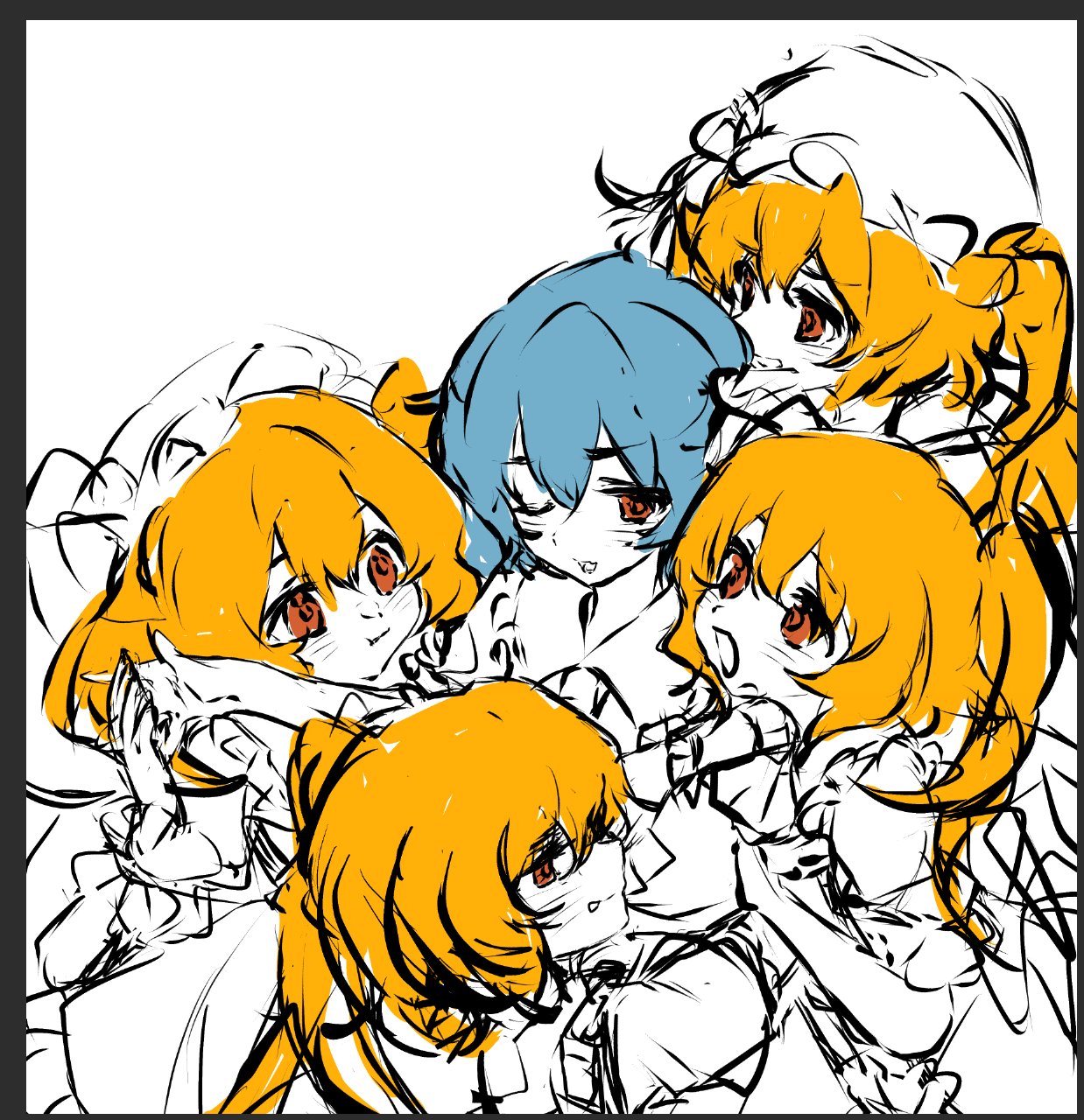 5girls blonde_hair blue_hair clone clone_harem flandre_scarlet hat highres hug llbzqsj medium_hair mob_cap multiple_girls one_eye_closed outline remilia_scarlet spot_color touhou white_background