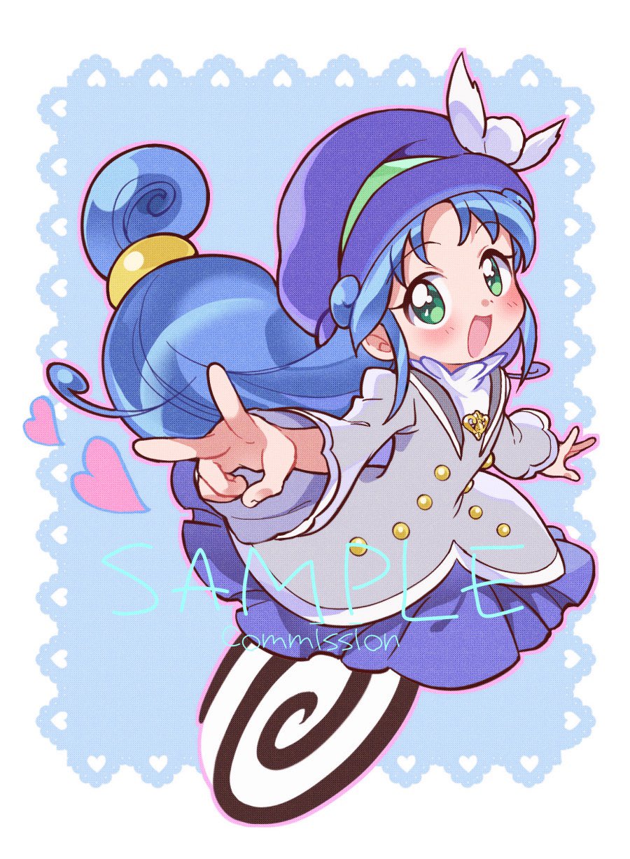 1girl :d blue_hair blue_hat blue_skirt blush buttons commission curly_hair full_body fushigiboshi_no_futago_hime fushigiboshi_no_futago_hime_gyu gold_buttons green_eyes grey_jacket hair_between_eyes hat hat_ornament heart heart_background highres jacket lace_background long_hair long_sleeves looking_at_viewer low-tied_long_hair open_mouth outstretched_arms pleated_skirt pom_pom_(clothes) pom_pom_hat_ornament reaching reaching_towards_viewer rein_(futagohime) royal_wonder_academy_school_uniform sample_watermark school_uniform skirt smile solo suzuki_(2red_moon3) v watermark wheel_o_feet white_background wide_sleeves