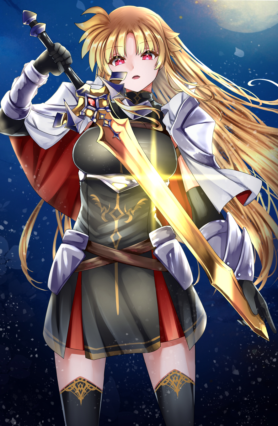 1girl :o adapted_weapon alternate_costume armor black_dress black_gloves black_thighhighs blonde_hair commentary_request dress elbow_gloves fate_testarossa gloves highres holding holding_sword holding_weapon long_hair looking_at_viewer lyrical_nanoha mahou_shoujo_lyrical_nanoha_strikers night paid_reward_available parted_bangs pauldrons red_eyes shoulder_armor sky solo sougetsu_izuki standing star_(sky) starry_sky sword thighhighs unsheathed weapon