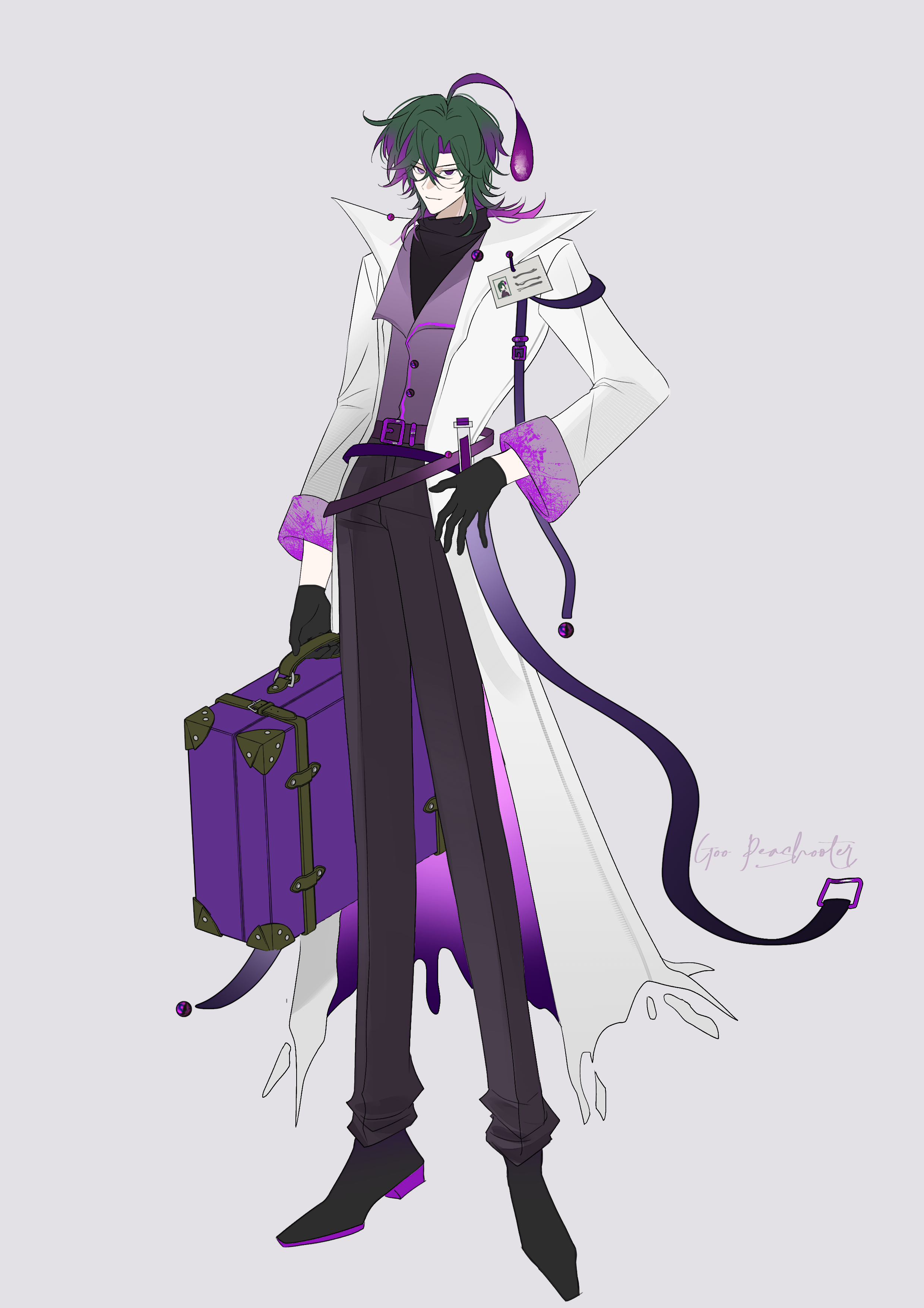 1boy absurdres ankle_socks arm_at_side belt black_boots black_gloves black_sweater boots brown_pants buttons character_name chinese_commentary closed_mouth coat collared_coat colored_inner_hair commentary_request curtained_hair full_body gloves goo_peashooter green_hair grey_background hair_between_eyes hand_on_own_hip heterochromia high_heel_boots high_heels highres holding holding_suitcase id_card lab_coat light_smile long_legs long_sleeves looking_at_viewer male_focus multicolored_hair open_clothes open_coat pale_skin pants personification plants_vs._zombies plants_vs._zombies_2 purple_belt purple_hair purple_vest rrtion simple_background socks solo standing streaked_hair suitcase sweater turtleneck turtleneck_sweater two-tone_hair v-shaped_eyebrows vest white_coat