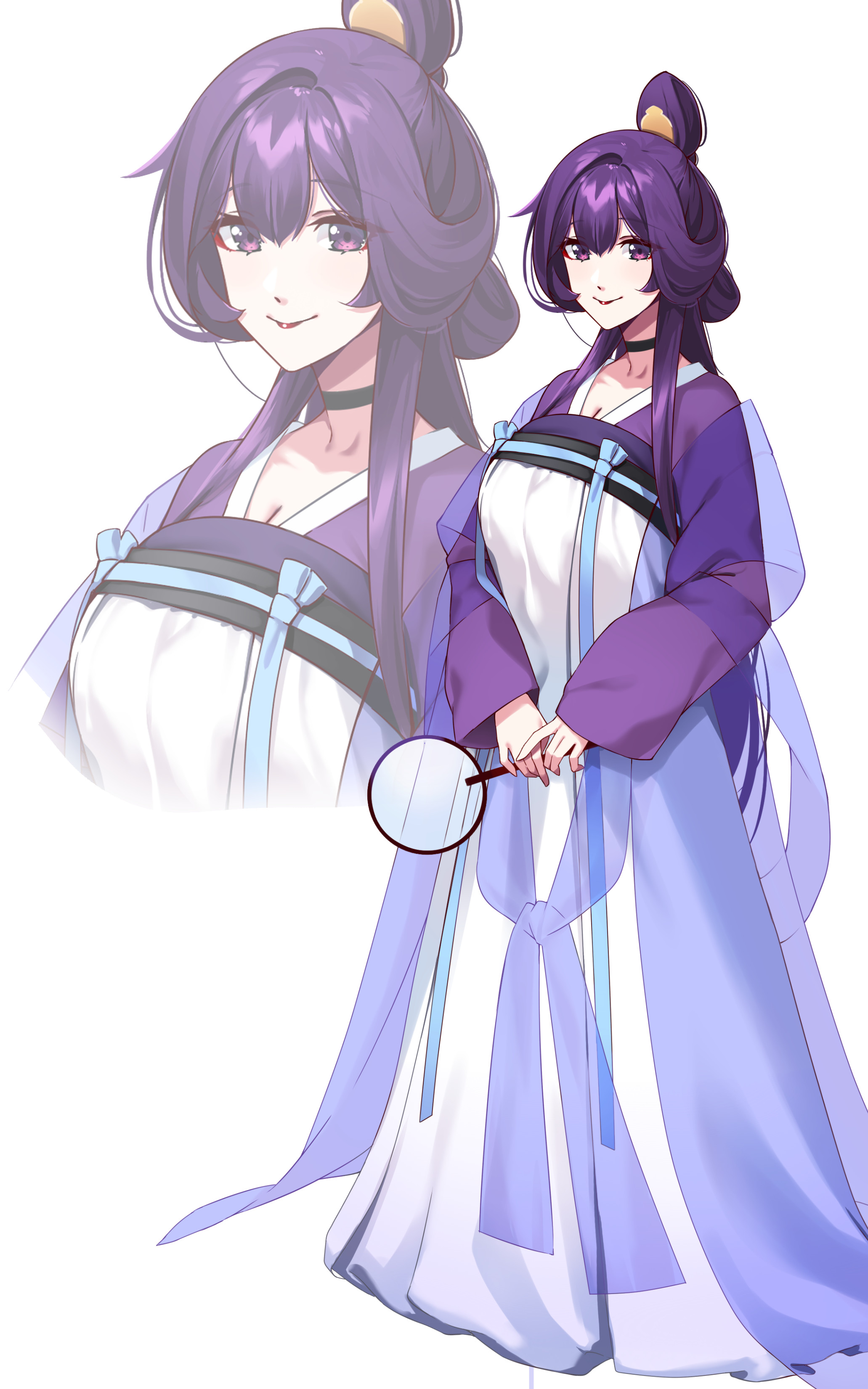 1girl absurdres breasts chinese_clothes hair_between_eyes hair_bun hand_fan hie_(hiememiko) hiememiko highres holding holding_fan large_breasts long_hair original purple_eyes purple_hair standing tuanshan very_long_hair zoom_layer