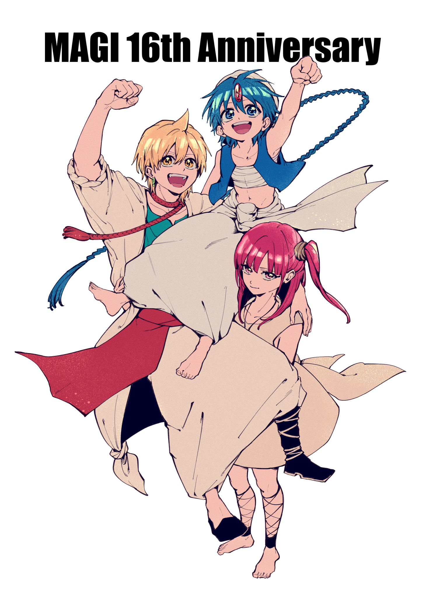 1girl 2boys aladdin_(magi) alibaba_saluja arabian_clothes blonde_hair blue_eyes blue_hair braid braided_ponytail carrying chest_sarashi clenched_hand copyright_name dress earrings forehead_jewel full_body hamariito happy_anniversary harem_pants highres hair_horns jewelry long_hair magi_the_labyrinth_of_magic morgiana multiple_boys one_side_up open_clothes open_mouth open_vest pants pink_eyes pink_hair princess_carry sarashi short_hair shoulder_carry simple_background single_braid smile standing vest white_background yellow_eyes