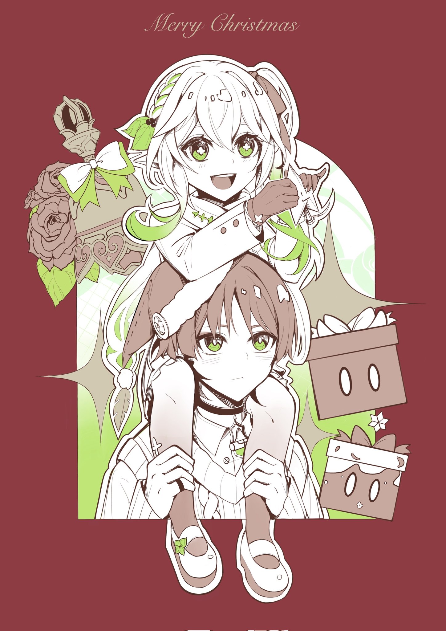 1boy 1girl alternate_costume alternate_eye_color bow box braid cable_knit choker choppy_bangs christmas_star closed_mouth coat collared_shirt eyelashes feathers flower fur-trimmed_headwear fur_trim genshin_impact gift gift_box gloves green_eyes green_hair hair_between_eyes hair_bow hair_ornament half_crown_braid hat highres holding holding_another's_legs layered_sleeves leaf leaf_hair_ornament light_blush limited_palette long_hair long_sleeves looking_at_another looking_at_object looking_up merry_christmas mistletoe_hair_ornament multicolored_hair nahida_(genshin_impact) open_mouth pantyhose pinky_ring pom_pom_(clothes) red_background ribbed_sweater rose santa_hat scaramouche_(genshin_impact) scarf shirt shoes side_ponytail sidelocks streaked_hair sweater tareme teeth touxin_0316 tulaytullah's_remembrance_(genshin_impact) undershirt upper_teeth_only white_hair winter_clothes winter_coat yellow_feathers