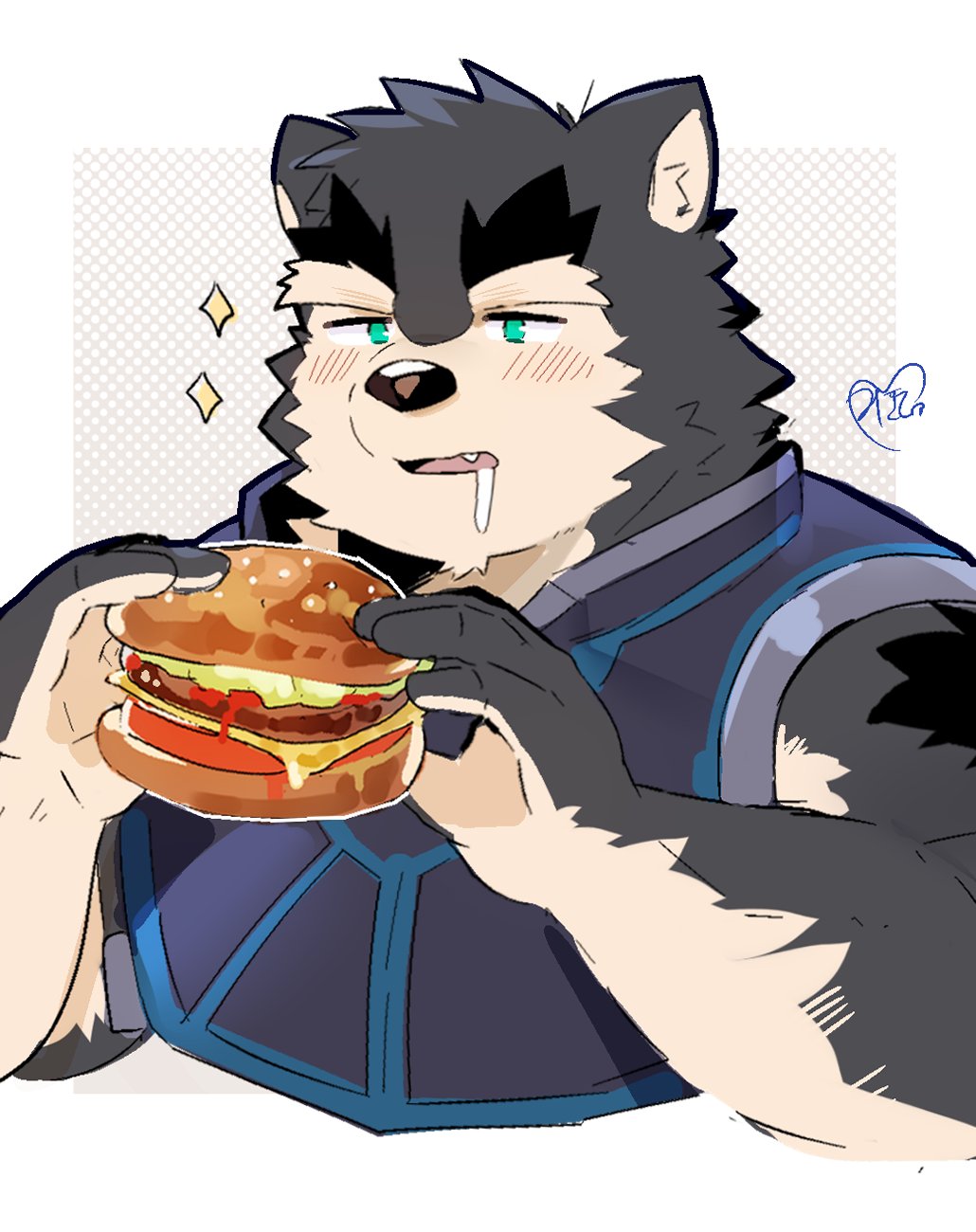 1boy animal_ears another_eidos-r bara biceps black_fur blue_eyes blush burger commentary dog_boy dog_ears animal_nose drooling fang food furry furry_male highres holding holding_burger holding_food hungry looking_at_food lyon_(another_eidos) mikiya_(mine_miki0840) signature sparkle upper_body