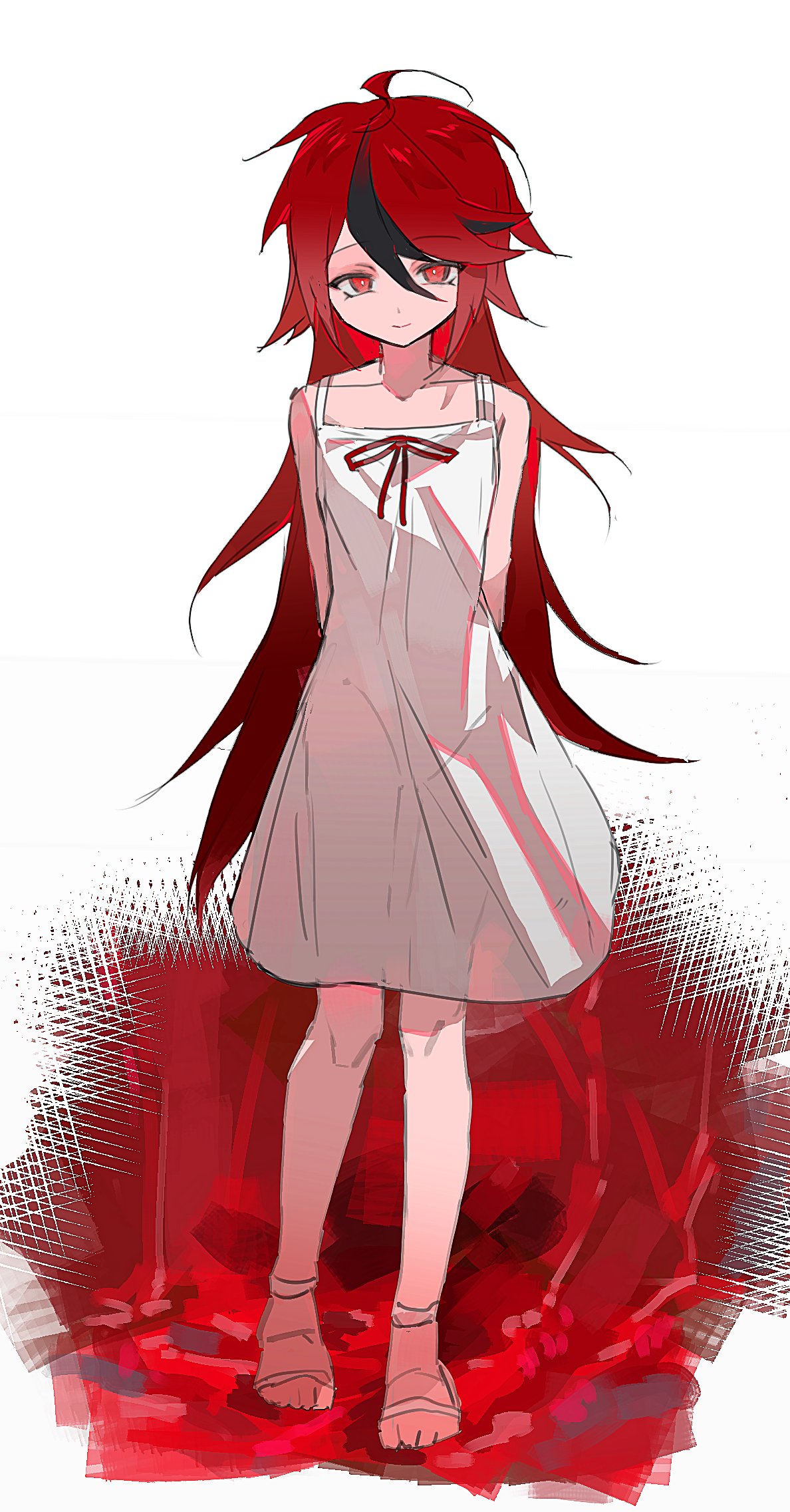 1girl aged_down ahoge barefoot black_hair closed_mouth collarbone cosplay feet female_focus full_body genderswap genderswap_(mtf) hair_between_eyes highres long_hair looking_at_viewer messy_hair possessed possession red_eyes red_hair saya_(saya_no_uta) saya_(saya_no_uta)_(cosplay) saya_no_uta simple_background smile standing sumino_takumi takumi-g_(hundred_line) the_hundred_line_-last_defense_academy- toes white_background