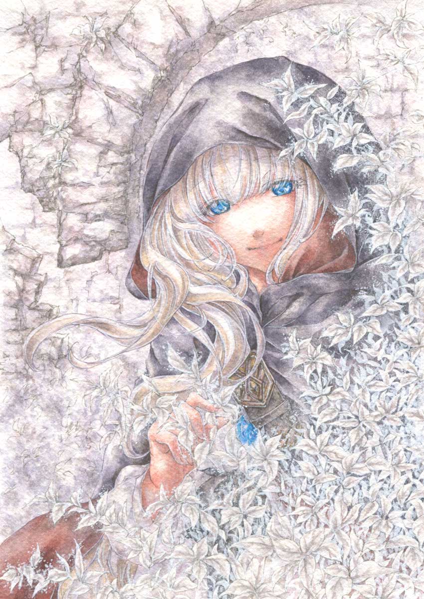 1girl black_cloak blue_eyes cloak ender_lilies_quietus_of_the_knights ender_magnolia_bloom_in_the_mist floating_hair flower grey_hair highres hood hood_up hooded_cloak jewelry lily_(ender_lilies) long_hair looking_at_viewer nanai_yuki painting_(medium) pendant smile solo traditional_media upper_body watercolor_(medium) white_flower