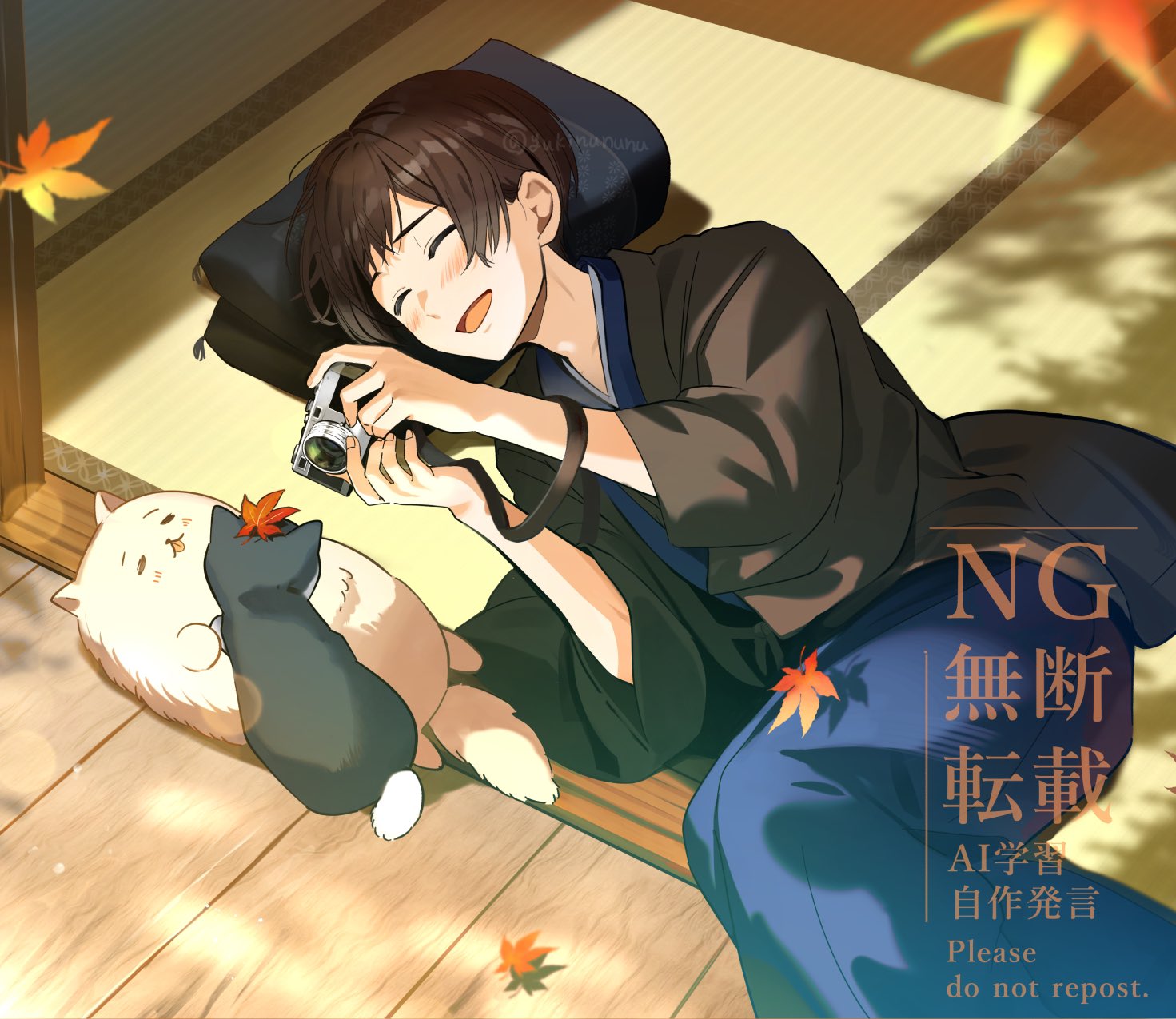 1boy animal animal_ears animal_nose artist_name axis_powers_hetalia black_cat black_fur blue_kimono blush brown_hair camera cat cat_ears cat_tail closed_eyes day dog dog_ears dog_tail fingernails floor hands_up haori happy highres holding holding_camera indoors japan_(hetalia) japanese_clothes kimono leaf long_sleeves lying male_focus maple_leaf on_side open_clothes open_mouth pet pillow shadow short_hair smile tail taking_picture tongue tongue_out watermark white_dog white_fur wide_sleeves yukata yukinununu
