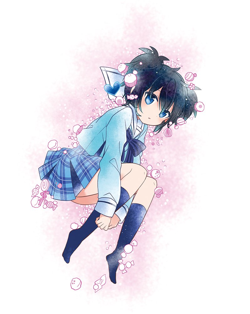 1girl black_hair blue_bow blue_bowtie blue_eyes blue_shirt blue_skirt blue_socks bow bowtie candy chocolate commentary_request dot_nose fetal_position food full_body hair_between_eyes happy_sugar_life heart high-waist_skirt hugging_own_legs kagisora_tomiyaki kneehighs koube_shio light_blush light_particles long_sleeves lying messy_hair miniskirt official_art on_side own_hands_together parted_lips plaid_clothes plaid_skirt pleated_skirt sailor_collar school_uniform second-party_source serafuku shirt short_hair skirt socks solo striped_bow striped_bowtie striped_clothes two_side_up white_background white_sailor_collar