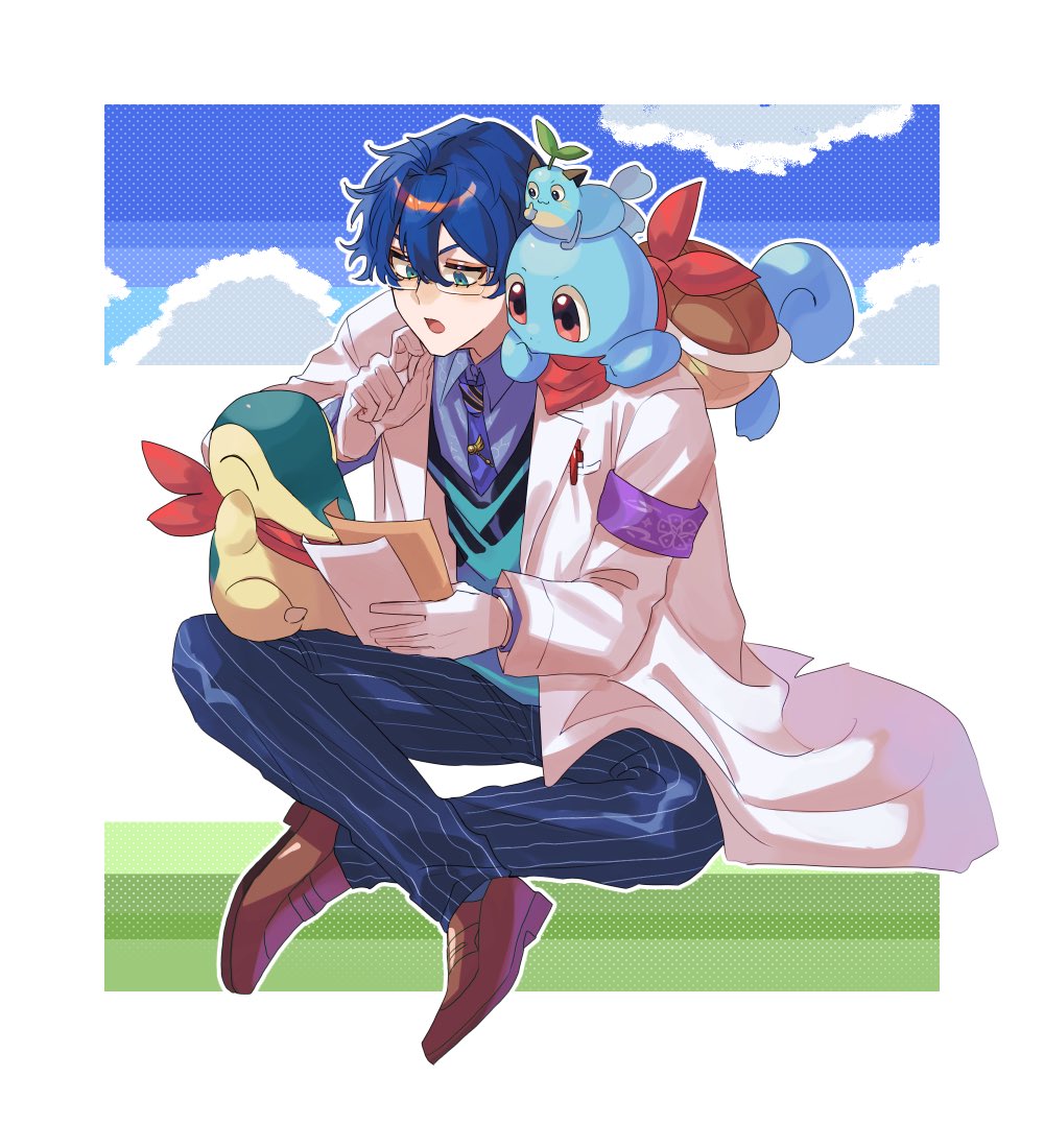 1boy animal animal_on_head aqua_eyes aqua_sweater_vest armband blue_hair blue_pants blue_sky border brown_shoes cloud coat cyndaquil full_body gen_1_pokemon gen_2_pokemon glasses gloves grey_shirt hair_between_eyes holding holding_paper holiuvre_318 lab_coat leos_vincent leos_vincent_(1st_costume) male_focus mameneko_(leos_vincent) nijisanji nintendo on_head on_shoulder outside_border pants paper pokemon pokemon_(creature) pokemon_on_shoulder purple_armband red_scarf scarf shirt shoes short_hair sky squirtle sweater_vest virtual_youtuber white_border white_coat white_gloves