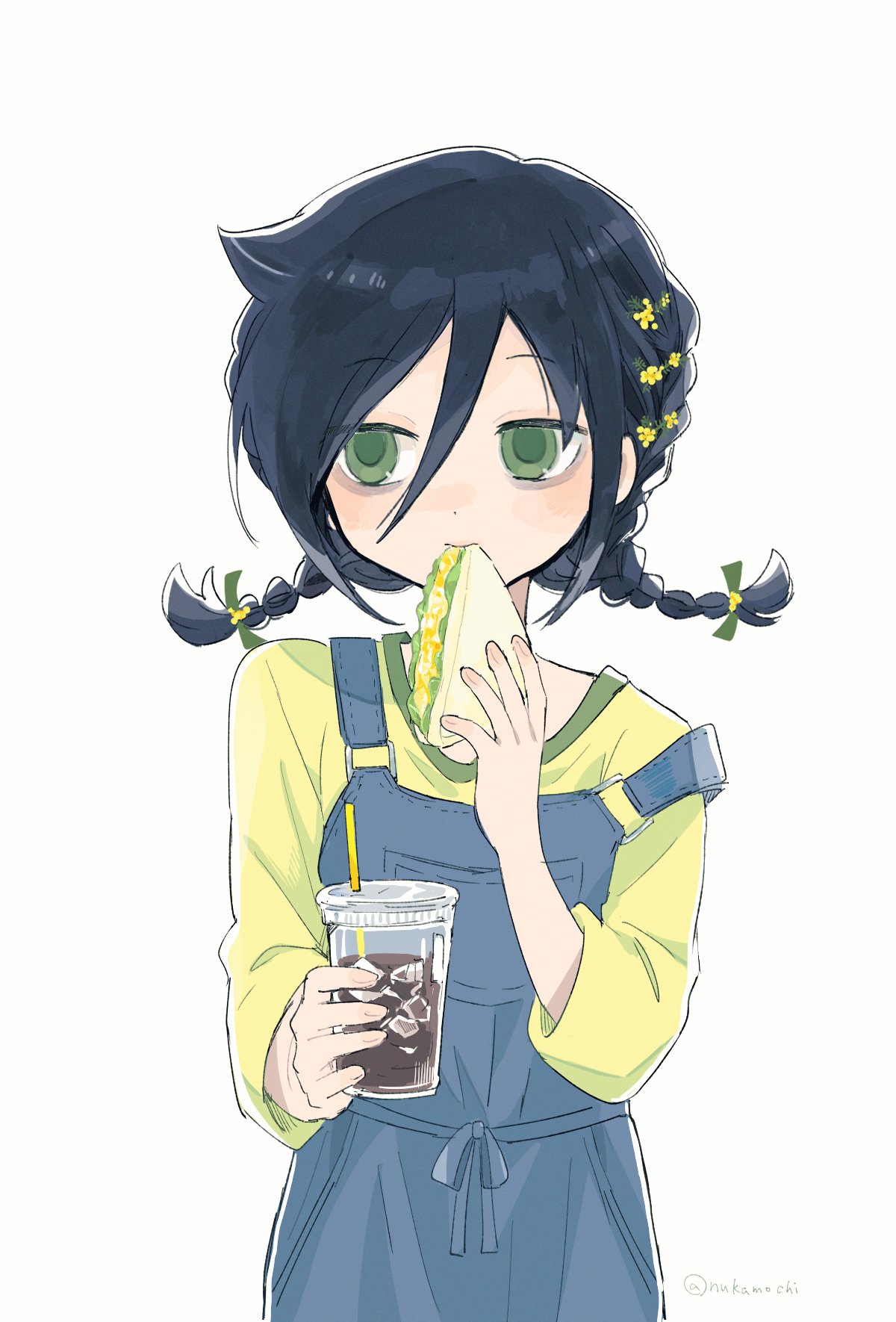 1girl alternate_hairstyle bags_under_eyes black_hair blue_overalls braid casual commentary_request cowboy_shot cup disposable_cup drink drinking_straw eating flower food green_eyes hair_between_eyes hair_flower hair_ornament hair_tie hand_up highres holding holding_cup holding_food holding_sandwich ice ice_cube kuroki_tomoko long_sleeves looking_to_the_side nuka_(nukamochi) overalls sandwich shirt sidelocks simple_background solo twin_braids twitter_username watashi_ga_motenai_no_wa_dou_kangaetemo_omaera_ga_warui! white_background yellow_flower yellow_shirt