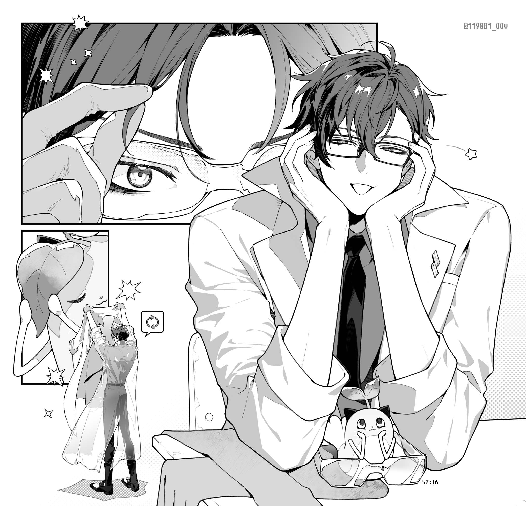 1198b1_oov 1boy belt boots coat collared_shirt elbows_on_table goggles greyscale hands_on_own_face highres holding holding_unworn_clothes leaf leaf_on_head leos_vincent lying male_focus mameneko_(leos_vincent) monochrome multiple_views necktie nijisanji on_stomach pants shirt short_hair twitter_username virtual_youtuber
