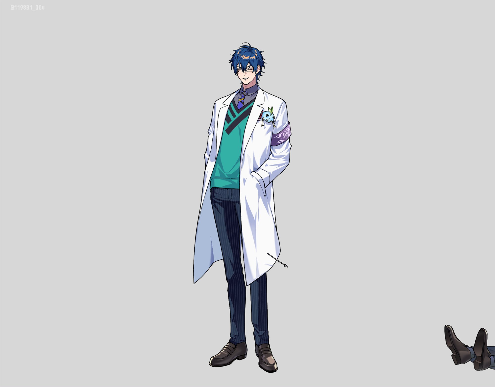 1198b1_oov 1boy animal animal_in_clothes aqua_sweater_vest armband blue_hair blue_necktie blue_pants brown_shoes closed_eyes coat full_body glasses grey_background grey_shirt hands_in_pockets highres lab_coat leos_vincent leos_vincent_(1st_costume) male_focus mameneko_(leos_vincent) necktie nijisanji pants pinstripe_pants pinstripe_pattern purple_armband shirt shoes short_hair simple_background smile sweater_vest teeth tie_clip virtual_youtuber white_coat