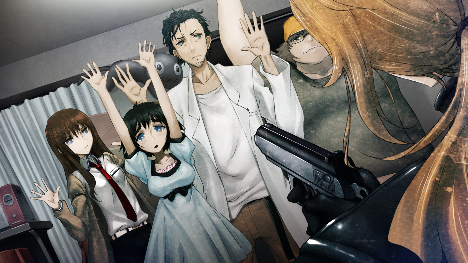 2boys 3girls adam's_apple aiming annoyed aqua_eyes arm_belt arms_up at_gunpoint beard_stubble belt beret black_bodysuit black_bow black_hair black_shorts black_trim blue_dress blue_eyes bodysuit bow breast_pocket breasts brown_hair brown_jacket brown_pants chest_bow coat collar collarbone collared_shirt curtains dress dutch_angle expressionless facial_hair fat fat_man finger_on_trigger frilled_collar frills from_behind frown future_gadget_lab game_cg green_shirt gun hair_between_eyes hair_over_shoulder hair_tie handgun hands_up hashida_itaru hat highres holding holding_gun holding_weapon huke indoors jacket jacket_partially_removed kiryuu_moeka lab_coat lapels large_breasts latex latex_bodysuit leather_belt long_sleeves makise_kurisu medium_breasts medium_hair messy_hair midriff multiple_boys multiple_girls necktie non-web_source notched_lapels official_art okabe_rintarou pants pink_frills pocket ponytail puffy_short_sleeves puffy_sleeves purple_eyes purple_trim red_necktie ringed_eyes science_adventure shiina_mayuri shirt shirt_partially_tucked_in short_sleeves shorts small_breasts square_pupils steins;gate stubble sweat sweatdrop t-shirt tareme weapon weapon_request white_belt white_coat white_shirt worried yellow_hat