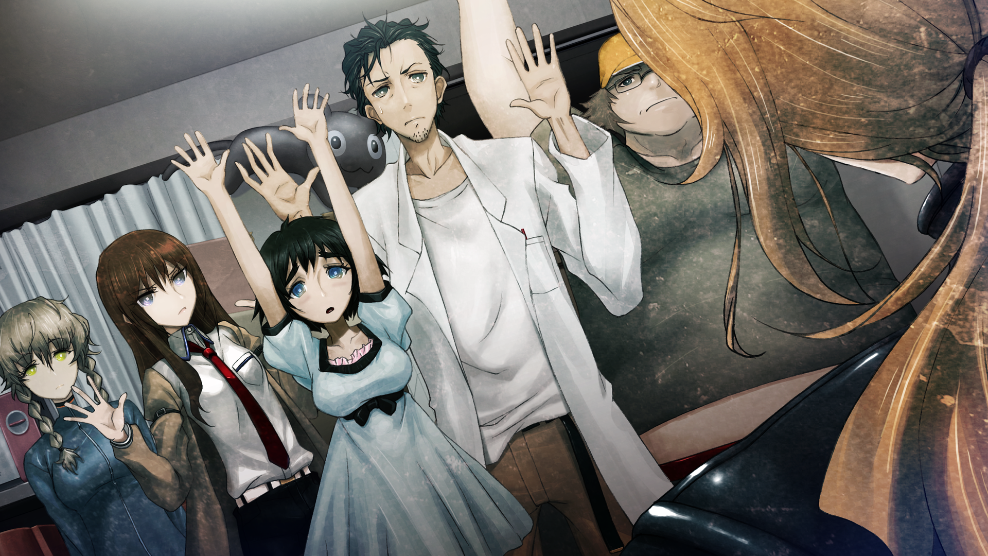 2boys 4girls adam's_apple amane_suzuha annoyed aqua_eyes arm_belt arms_up beard_stubble belt beret black_bodysuit black_bow black_hair black_shorts black_trim blue_dress blue_eyes blue_jacket bodysuit bow braid breast_pocket breasts brown_hair brown_jacket brown_pants chest_bow coat collar collarbone collared_shirt curtains dress dutch_angle expressionless facial_hair fat fat_man frilled_collar frills from_behind frown future_gadget_lab game_cg green_eyes green_shirt hair_between_eyes hair_over_shoulder hair_tie hands_up hashida_itaru hat high_collar highres huke indoors jacket jacket_partially_removed kiryuu_moeka lab_coat lapels large_breasts latex latex_bodysuit leather_belt long_sleeves makise_kurisu medium_breasts medium_hair messy_hair midriff multiple_boys multiple_girls necktie non-web_source notched_lapels official_art okabe_rintarou pants pink_frills pocket ponytail puffy_short_sleeves puffy_sleeves purple_eyes purple_trim red_belt red_necktie ringed_eyes science_adventure shiina_mayuri shirt shirt_partially_tucked_in short_sleeves shorts small_breasts square_pupils steins;gate stubble sweat sweatdrop t-shirt tareme track_jacket twin_braids twintails white_belt white_coat white_shirt worried yellow_hat zipper zipper_pull_tab