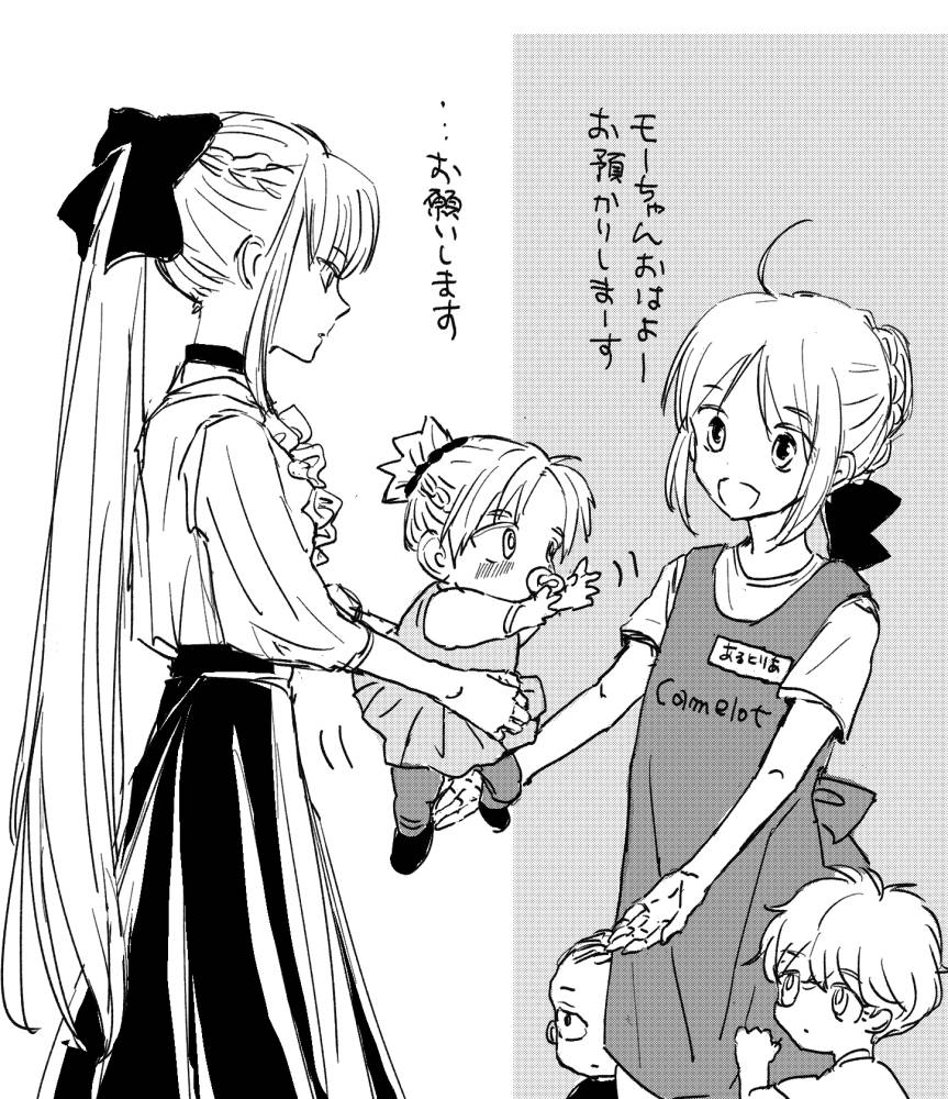 2boys 3girls aged_down apron artoria_pendragon_(fate) baby braid bun_with_braided_base carrying carrying_baby carrying_person child choker commentary_request fate/grand_order fate_(series) gawain_(fate) greyscale hair_bun high-waist_skirt long_hair monochrome mordred_(fate) morgan_le_fay_(fate) mother_and_child mother_and_daughter multiple_boys multiple_girls pacifier ponytail saber_(fate) short_ponytail single_hair_bun skirt translation_request very_long_hair yuyu_fate