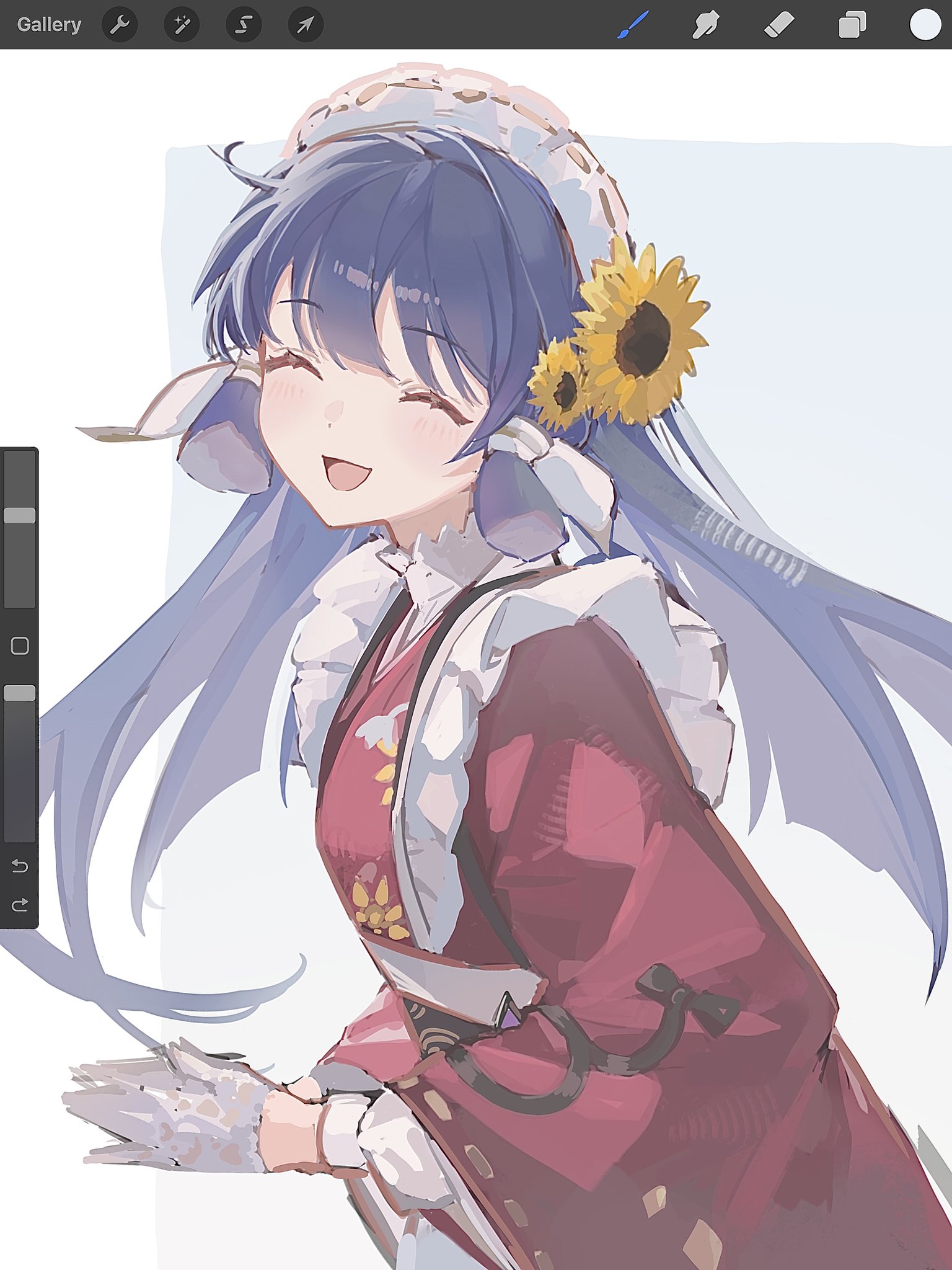 1girl :d art_program_in_frame blue_background blue_hair blunt_tresses blush facing_viewer flower gloves hair_flower hair_ornament half_gloves highres japanese_clothes kimono long_hair maid maid_headdress nanoha_(stella_sora) open_mouth procreate_(medium) red_kimono simple_background smile solo soybean_(hisoybean) stella_sora sunflower sunflower_hair_ornament wa_maid white_gloves