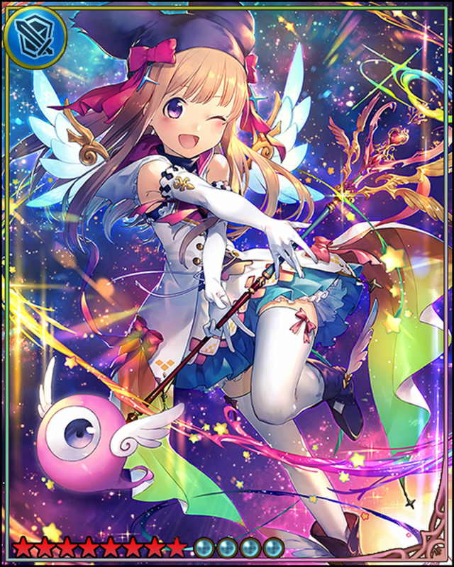 1girl brown_hair hat holding holding_staff long_hair lou_(magical_girl)_(shingeki_no_bahamut) lou_(shingeki_no_bahamut) mage_staff magical_girl mascot official_art one_eye_closed open_mouth shingeki_no_bahamut smile staff thighhighs third-party_source white_thighhighs wings