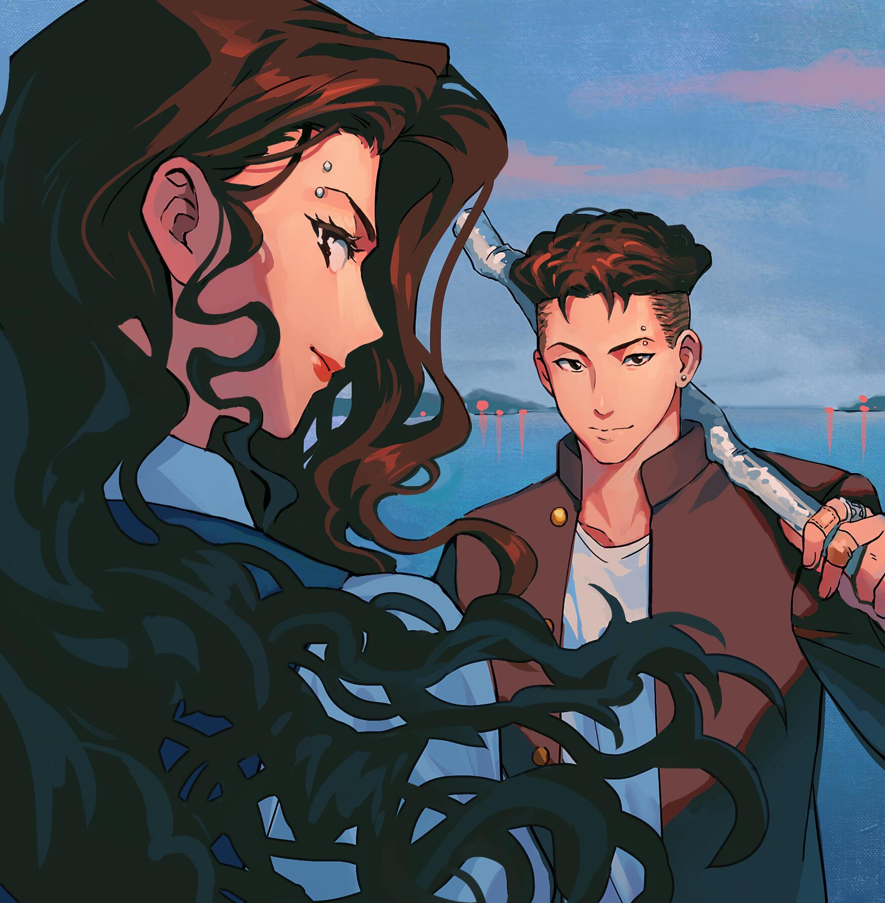1boy 1girl ayako_(slam_dunk) bandaid bandaid_on_finger bandaid_on_hand black_hair brown_hair brown_jacket closed_mouth dusk earrings eyebrow_piercing eyelashes face_piercing fingernails highres holding holding_lead_pipe jacket jewelry lake lalatia-meai lead_pipe long_hair miyagi_ryouta ocean over_shoulder piercing shirt slam_dunk_(series) undercut wavy_hair white_shirt