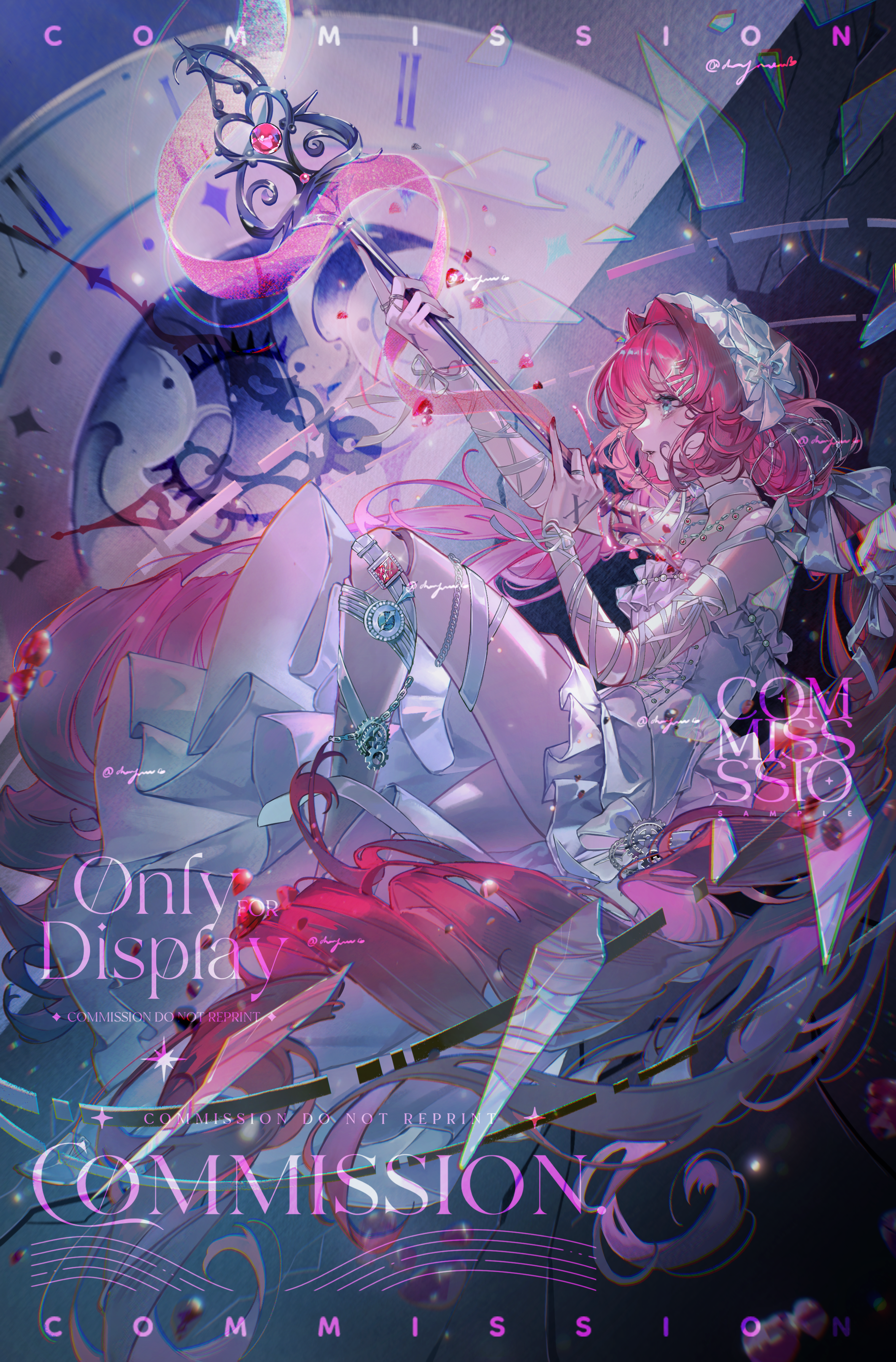 1girl absurdres blue_eyes changmao clock dress hair_ornament high_heels highres holding long_hair original pink_hair solo very_long_hair white_dress