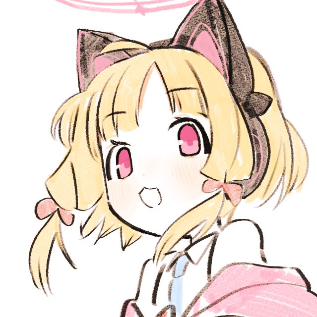 1girl ahoge animal_ear_headphones animal_ears blonde_hair blue_archive blue_necktie cat_ear_headphones cat_ears collared_shirt fake_animal_ears halo headphones looking_at_viewer low_twintails momoi_(blue_archive) necktie open_mouth parted_bangs pink_eyes pink_halo portrait shinbashi_seiji shirt short_hair simple_background sketch smile solo twintails white_background white_shirt