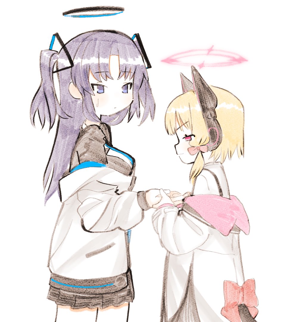 2girls animal_ear_headphones animal_ears black_halo black_jacket black_skirt blonde_hair blue_archive blue_eyes bow cat_ear_headphones cat_ears cat_tail fake_animal_ears hair_bow halo headphones height_difference holding_hands hood hooded_jacket jacket long_hair looking_at_another low_twintails momoi_(blue_archive) multiple_girls pink_eyes pink_halo pleated_skirt purple_hair red_bow shinbashi_seiji shirt short_hair simple_background sketch skirt smile smug tail twintails two_side_up white_background white_jacket white_shirt yuuka_(blue_archive)