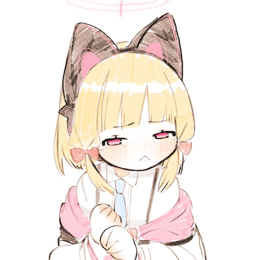 1girl :< animal_ear_headphones animal_ears blonde_hair blue_archive blue_necktie blush cat_ear_headphones cat_ears closed_mouth collared_shirt crying fake_animal_ears frown half-closed_eyes halo headphones hood hooded_jacket jacket looking_at_viewer low_twintails momoi_(blue_archive) necktie off_shoulder pink_eyes pink_halo sad shinbashi_seiji shirt short_hair simple_background sketch solo tears twintails upper_body white_background white_jacket white_shirt