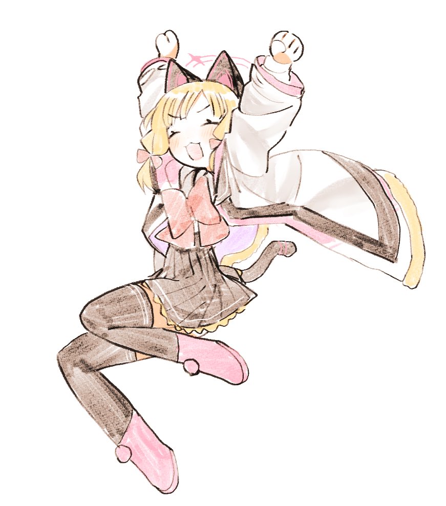 1girl animal_ear_headphones animal_ears ankle_boots arms_up black_skirt black_thighhighs blonde_hair blue_archive boots bow bowtie cat_ear_headphones cat_ears cat_tail closed_eyes fake_animal_ears hair_bow halo headphones jacket low_twintails momoi_(blue_archive) open_mouth pink_boots pink_halo pleated_skirt red_bow red_bowtie shinbashi_seiji short_hair simple_background sketch skirt solo tail thighhighs twintails white_background white_jacket