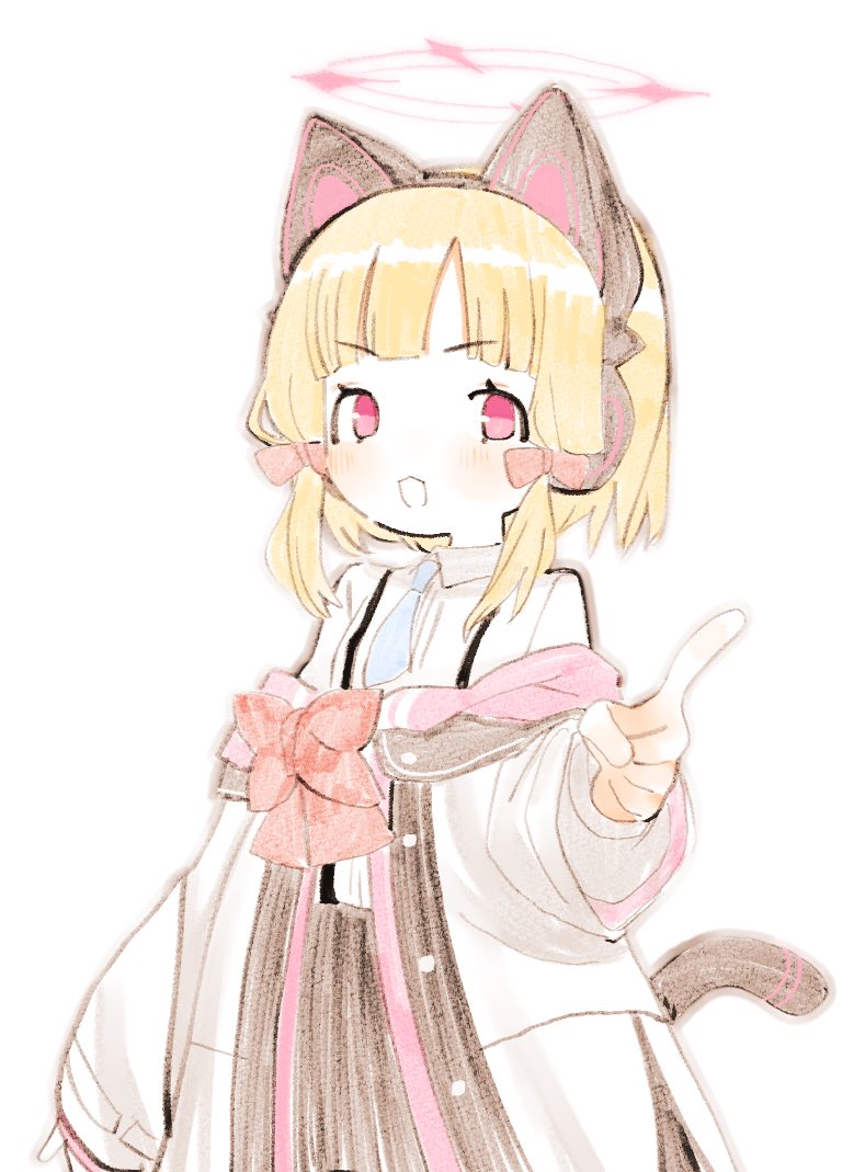 1girl animal_ear_headphones animal_ears blonde_hair blue_archive blue_necktie bow bowtie cat_ear_headphones cat_ears cat_tail collared_shirt fake_animal_ears hair_bow halo headphones hood hooded_jacket index_finger_raised jacket looking_at_viewer low_twintails momoi_(blue_archive) necktie off_shoulder open_mouth pink_eyes pink_halo red_bow red_bowtie shinbashi_seiji shirt short_hair simple_background sketch solo tail twintails white_background white_jacket white_shirt