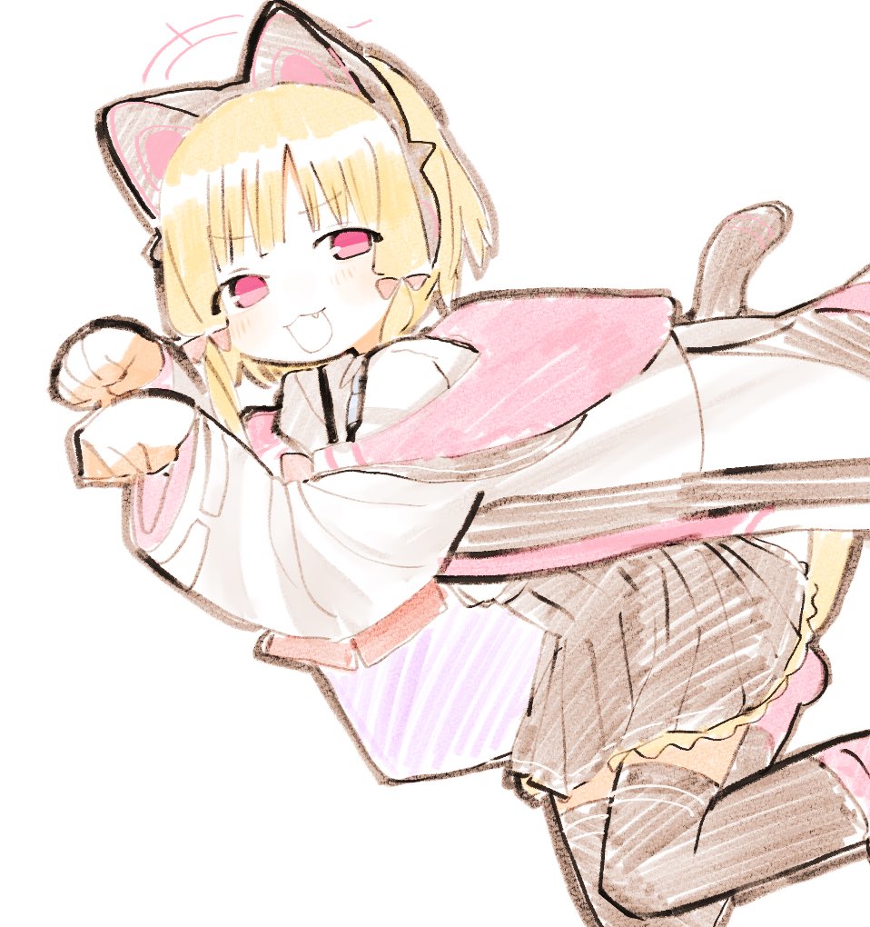 1girl animal_ear_headphones animal_ears black_skirt black_thighhighs blonde_hair blue_archive cat_ear_headphones cat_ears cat_tail fake_animal_ears fang halo headphones jacket low_twintails momoi_(blue_archive) open_mouth paw_pose pink_eyes pink_halo pleated_skirt school_uniform shinbashi_seiji shirt short_hair simple_background sketch skirt smile solo tail thighhighs twintails white_background white_jacket white_shirt