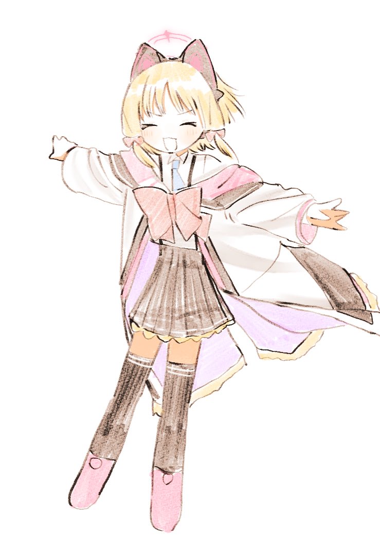 1girl animal_ear_headphones animal_ears ankle_boots black_skirt black_thighhighs blonde_hair blue_archive blue_necktie boots bow bowtie cat_ear_headphones cat_ears closed_eyes collared_shirt facing_viewer fake_animal_ears full_body hair_bow halo happy headphones jacket low_twintails momoi_(blue_archive) necktie off_shoulder open_mouth pink_boots pink_halo pleated_skirt red_bow red_bowtie school_uniform shinbashi_seiji shirt short_hair simple_background sketch skirt solo thighhighs twintails white_jacket white_shirt