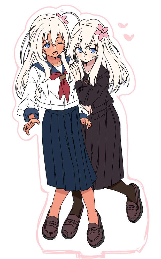 2girls ahoge alakoala alternate_costume black_sailor_collar black_serafuku black_shirt black_skirt black_socks blue_sailor_collar blue_skirt brown_shoes dark-skinned_female dark_skin dual_persona full_body kantai_collection loafers long_skirt long_sleeves multiple_girls no_socks one-piece_tan one_eye_closed pleated_skirt ro-500_(kancolle) sailor_collar school_uniform serafuku shirt shoes skirt socks tan tanline u-511_(kancolle) white_shirt