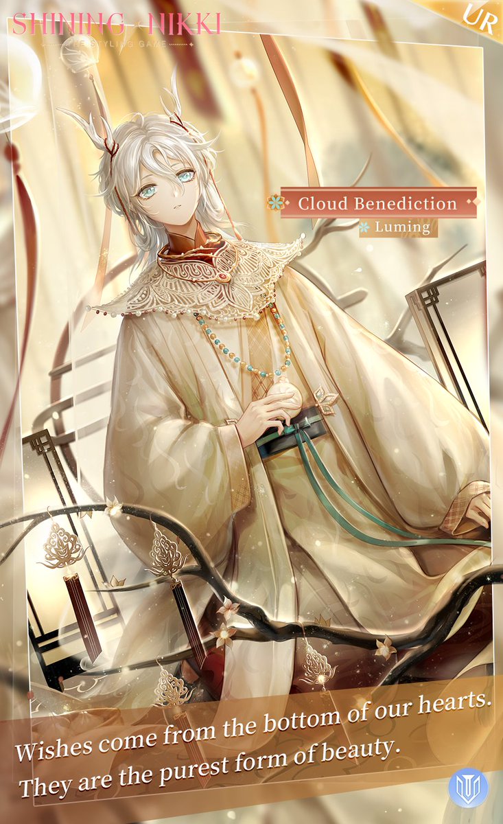 1boy aqua_ribbon artist_request bead_necklace beads blue_eyes branch card_(medium) character_name chinese_clothes commentary copyright_name dragon_horns dutch_angle english_commentary english_text expressionless forest full_body hair_between_eyes hand_on_own_stomach hanfu highres horn_ornament horn_ribbon horns jewelry kneeling lattice light_particles logo long_sleeves looking_ahead luming_(shining_nikki) male_focus medium_hair nature necklace nikki_(series) official_art outdoors parted_lips puffy_long_sleeves puffy_sleeves red_ribbon ribbon robe second-party_source shining_nikki skirt solo sunrise waist_ribbon white_hair white_hanfu white_horns white_robe wide_sleeves wind_chime yellow_skirt yunjian