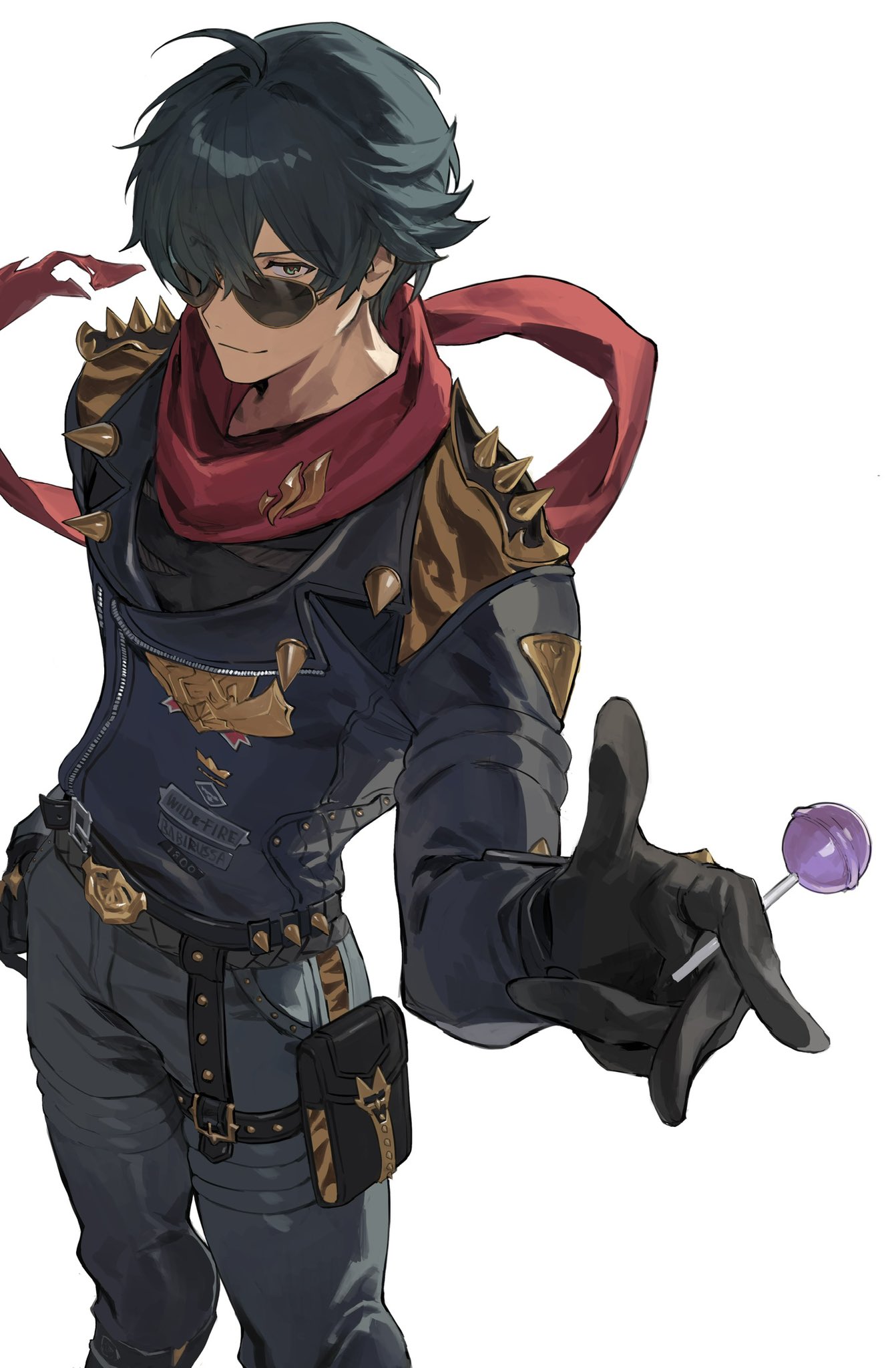 1boy animal_print belt belt_buckle black_belt black_gloves black_jacket black_pants buckle candy food gloves green_eyes green_hair hair_over_one_eye hashibiro_kou_(garapiko_p) highres holding holding_candy holding_food holding_lollipop jacket leather leather_jacket lighter_(zenless_zone_zero) lollipop looking_at_viewer pants red_scarf scarf shoulder_spikes simple_background smile solo spiked_belt spiked_jacket spikes studded_gloves sunglasses tiger_print torn_clothes torn_scarf white_background zenless_zone_zero