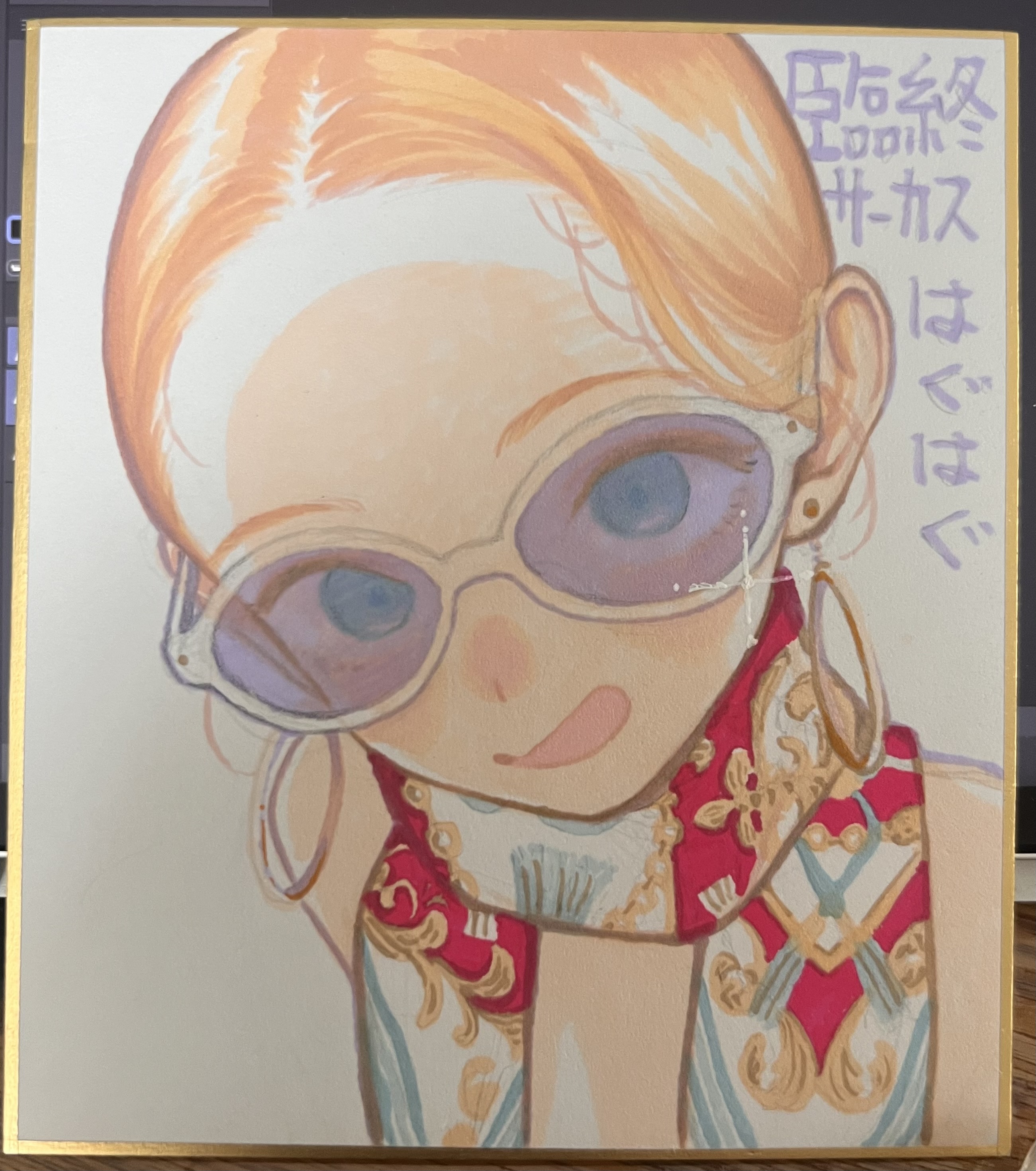 1girl :q absurdres blonde_hair blue_eyes earrings flat_chest haguhagu_(rinjuu_circus) highres hoop_earrings jewelry licking_lips looking_at_viewer original photo_(medium) sasha_(haguhagu) scarf shikishi smile solo sunglasses tongue tongue_out traditional_media upper_body