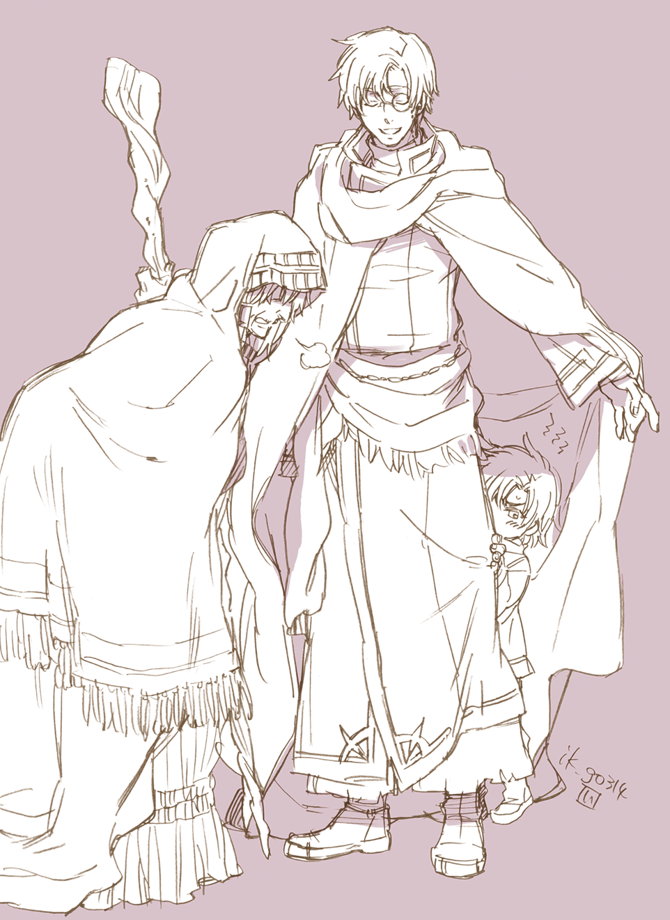 1girl 2boys age_difference aged_down bad_id bad_pixiv_id behind_another canas_(fire_emblem) child cloak closed_eyes clothes_grab commentary father_and_child father_and_son fire_emblem fire_emblem:_the_binding_blade fire_emblem:_the_blazing_blade grandmother_and_grandson greyscale height_difference hiding hiding_behind_another highres holding holding_staff hood hood_up hooded_cloak hugh_(fire_emblem) inagi long_sleeves looking_at_another monochrome monocle mother_and_child mother_and_son multiple_boys niime_(fire_emblem) nintendo old old_woman parent_and_child peeking_out puff_of_air robe sash shaded_face shoes short_hair simple_background sketch smile staff standing twitter_username