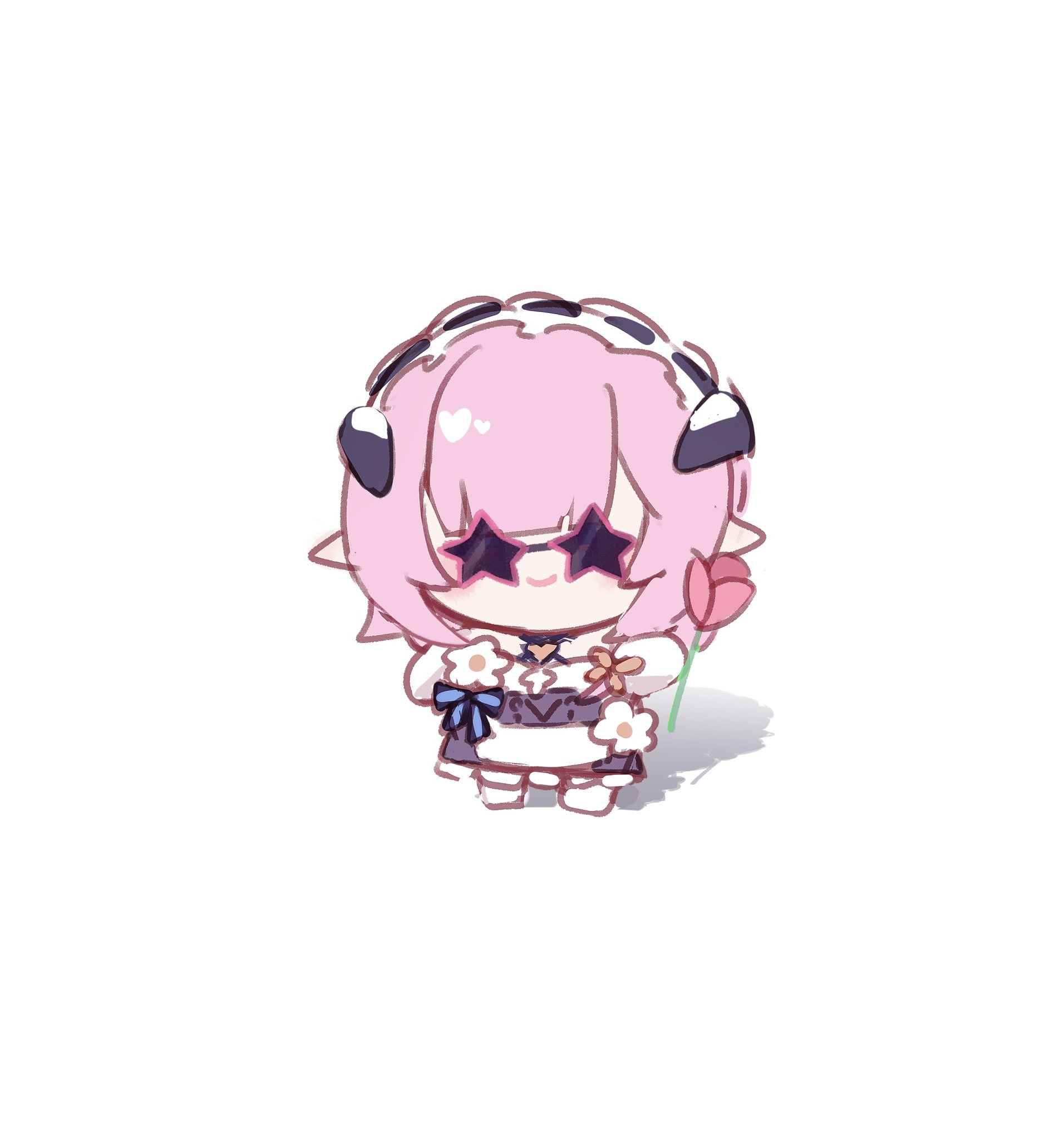 1girl black_dress blush chibi chibi_only closed_mouth dress elysia_(honkai_impact) elysia_(miss_pink)_(honkai_impact) elysia_(miss_pink_elf)_(honkai_impact) flower gloves highres holding holding_flower honkai_(series) honkai_impact_3rd maid_headdress official_alternate_costume pink-framed_eyewear pink_flower pink_hair pink_rose pointy_ears rose sidelocks simple_background smile solo star-shaped_eyewear star_(symbol) sunglasses tdatnst white_background white_gloves