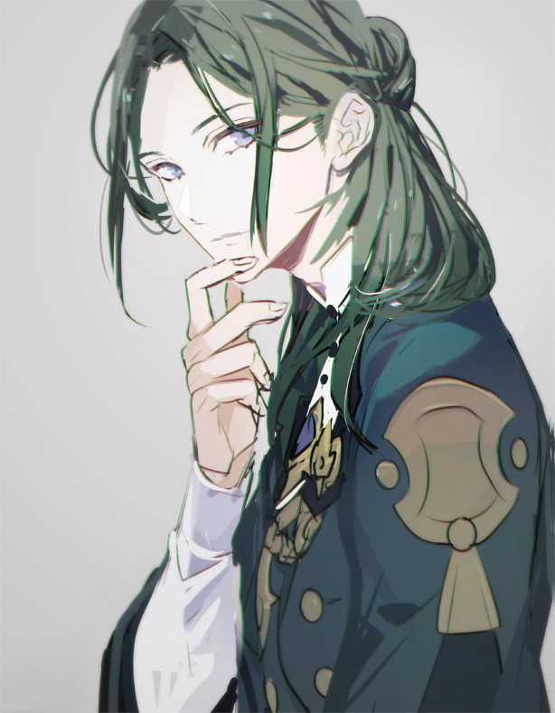 1boy arm_up blue_eyes blue_jacket buttons closed_mouth curtained_hair fingernails fire_emblem fire_emblem:_three_houses green_hair grey_background hair_behind_ear hand_on_own_chin jacket linhardt_von_hevring linhardt_von_hevring_(timeskip) long_hair long_sleeves looking_to_the_side male_focus nintendo shirt short_sideburns sideburns sideways_glance simple_background solo tassel tsukimura_noe upper_body white_shirt