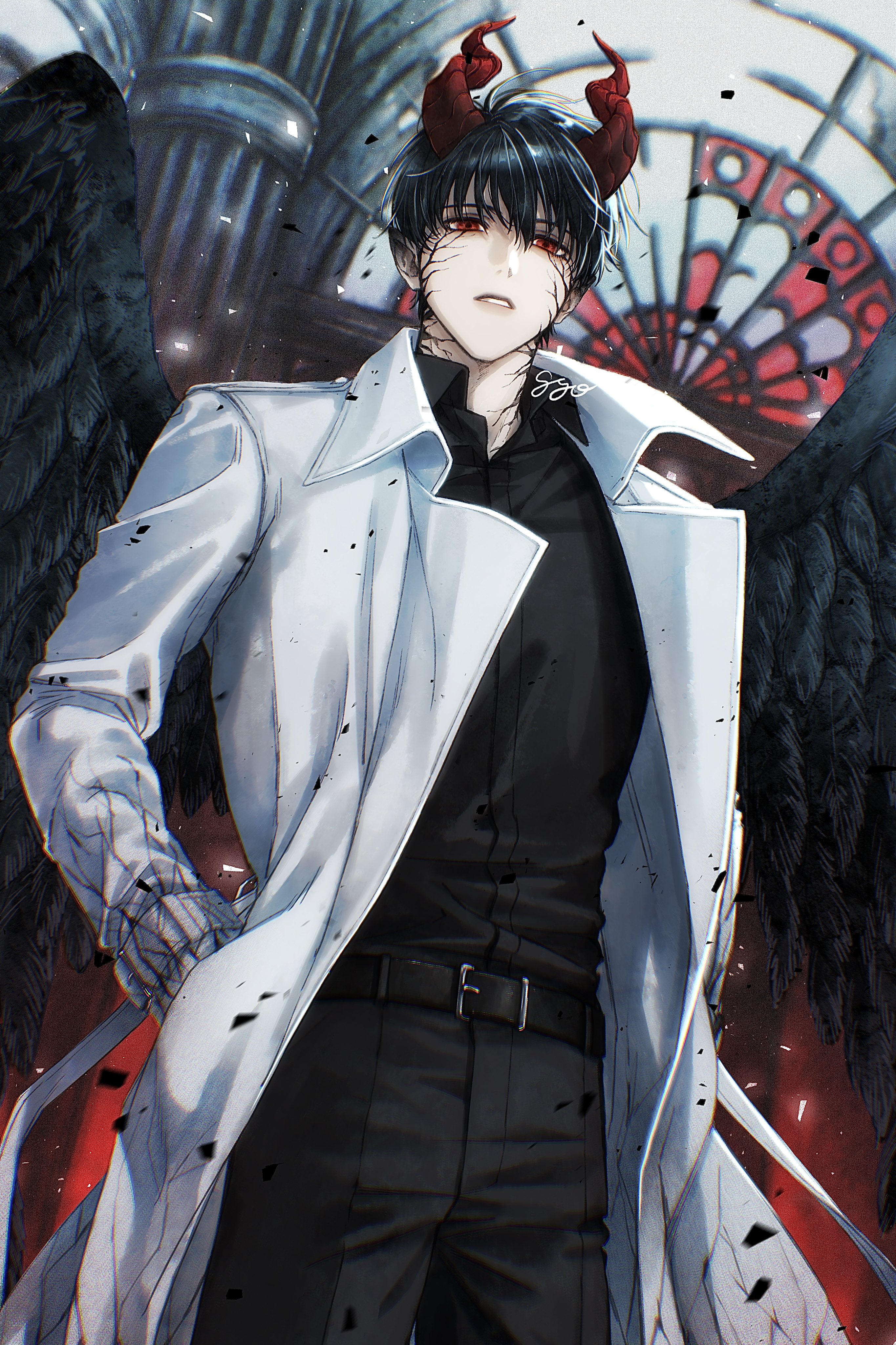 1boy absurdres belt black_belt black_hair black_pants black_shirt black_wings coat collared_shirt from_below gyo_(gyoza143gyoza) hand_in_pocket highres horns kim_dokja long_sleeves looking_at_viewer male_focus omniscient_reader's_viewpoint pants red_eyes red_horns shirt short_hair solo standing white_coat wings