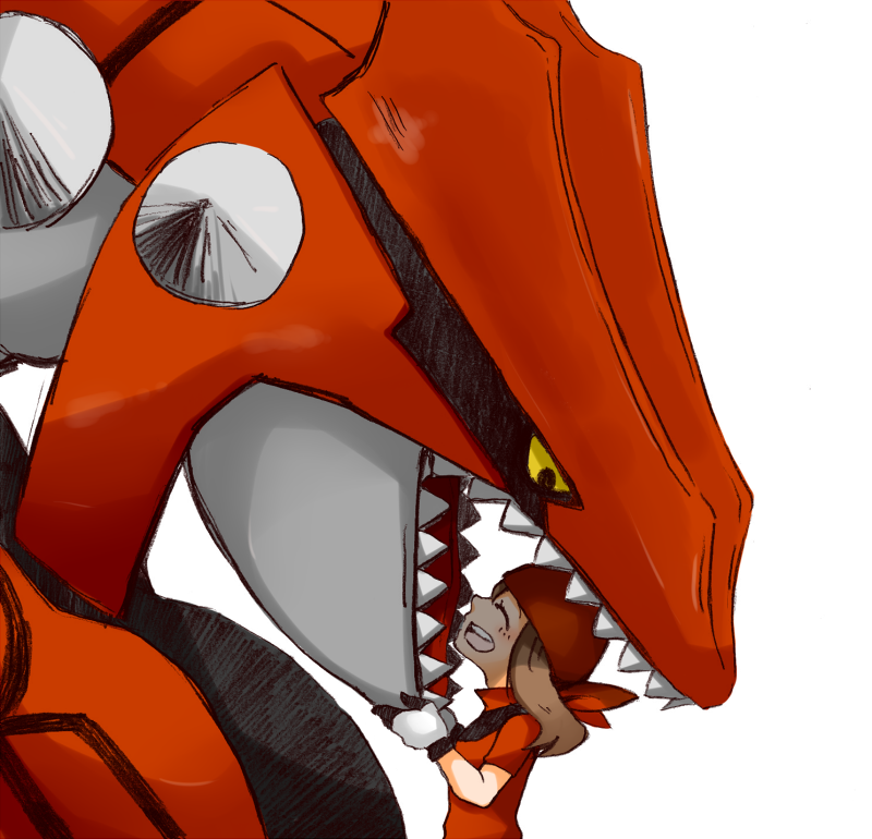 1girl bandana brown_hair closed_eyes colored_sclera gen_3_pokemon groudon legendary_pokemon may_(pokemon) nakamura_nakako nintendo open_mouth pokemon pokemon_(creature) pokemon_ruby/sapphire/emerald red_bandana red_shirt shirt simple_background white_background