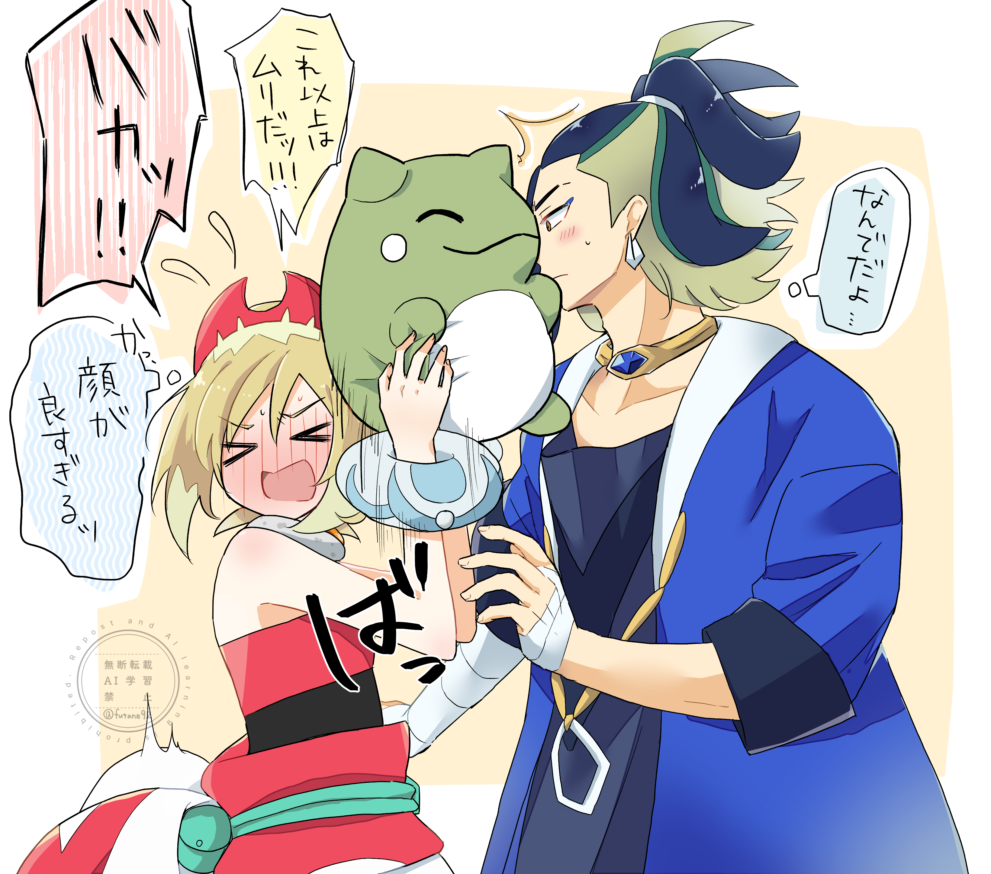 >_< 1boy 1girl absurdres adaman_(pokemon) arm_wrap blonde_hair blue_coat blue_hair blush coat collarbone eyebrow_cut full-face_blush highres irida_(pokemon) kazune_(kazukana09) motion_lines multicolored_hair nintendo pokemon pokemon_legends:_arceus shoulder_blush substitute_(pokemon) translation_request two-tone_hair watermark