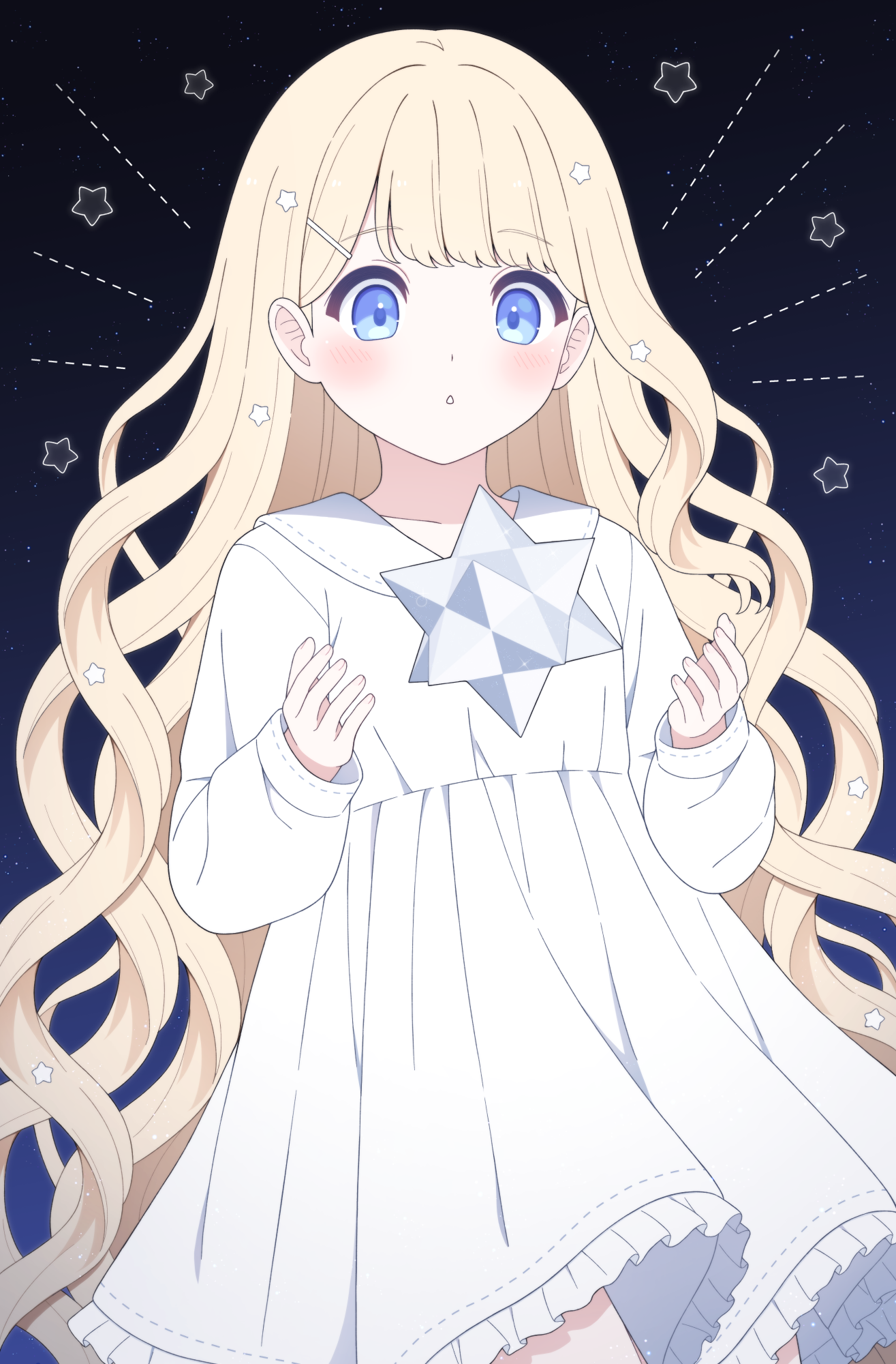 1girl blonde_hair blue_eyes blush cowboy_shot dot_nose dress drill_hair frilled_dress frills hair_ornament hairclip highres holding holding_star long_hair long_sleeves looking_at_object night original parted_lips san_nana sky solo star_(sky) star_(symbol) star_hair_ornament starry_sky very_long_hair white_dress
