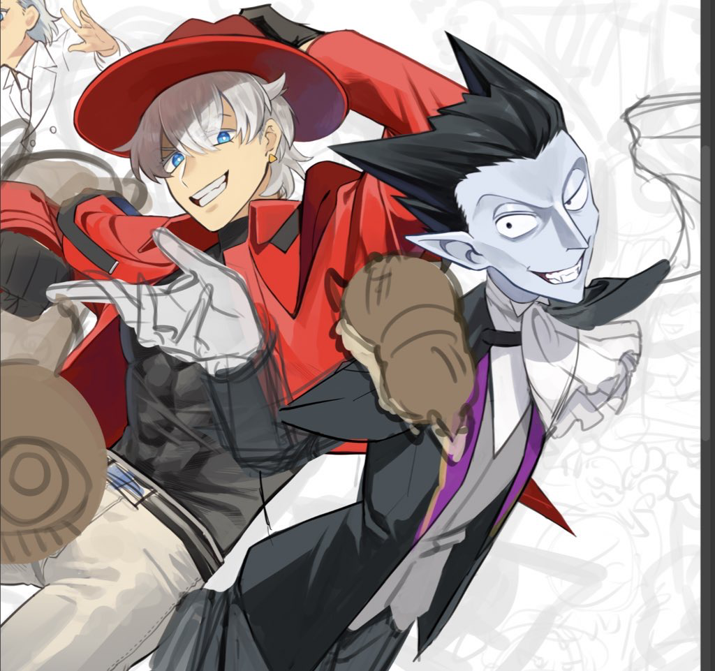 3boys ascot black_gloves black_hair blue_eyes colored_skin draluc_(kyuuketsuki_sugu_shinu) gloves grey_skin grey_vest grin hat hiyoshi_(kyuuketsuki_sugu_shinu) jacket kyuuketsuki_sugu_shinu male_focus mikenyun multiple_boys pants pointy_ears red_hat red_jacket ronaldo_(kyuuketsuki_sugu_shinu) smile spiked_hair vampire vest white_ascot white_hair