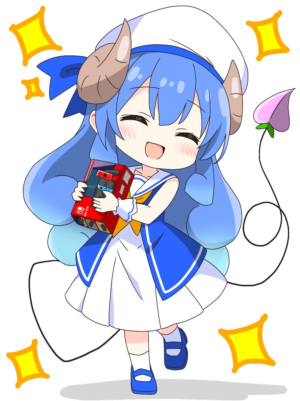 1girl :d ^_^ alternate_hair_color bare_shoulders blue_dress blue_hair blue_ribbon blue_shoes blush brown_horns closed_eyes commentary_request curled_horns curly_hair demon_girl demon_tail dress full_body hat hat_ribbon highres holding horns kotatsu-mazoku lilith_(homunculus)_(machikado_mazoku) lilith_(machikado_mazoku) long_hair looking_at_viewer machikado_mazoku mary_janes neckerchief nintendo_switch open_mouth ribbon sailor_collar sailor_dress shoes sidelocks simple_background sleeveless sleeveless_dress smile socks solo sparkle standing tail white_background white_hat white_sailor_collar white_socks yellow_neckerchief