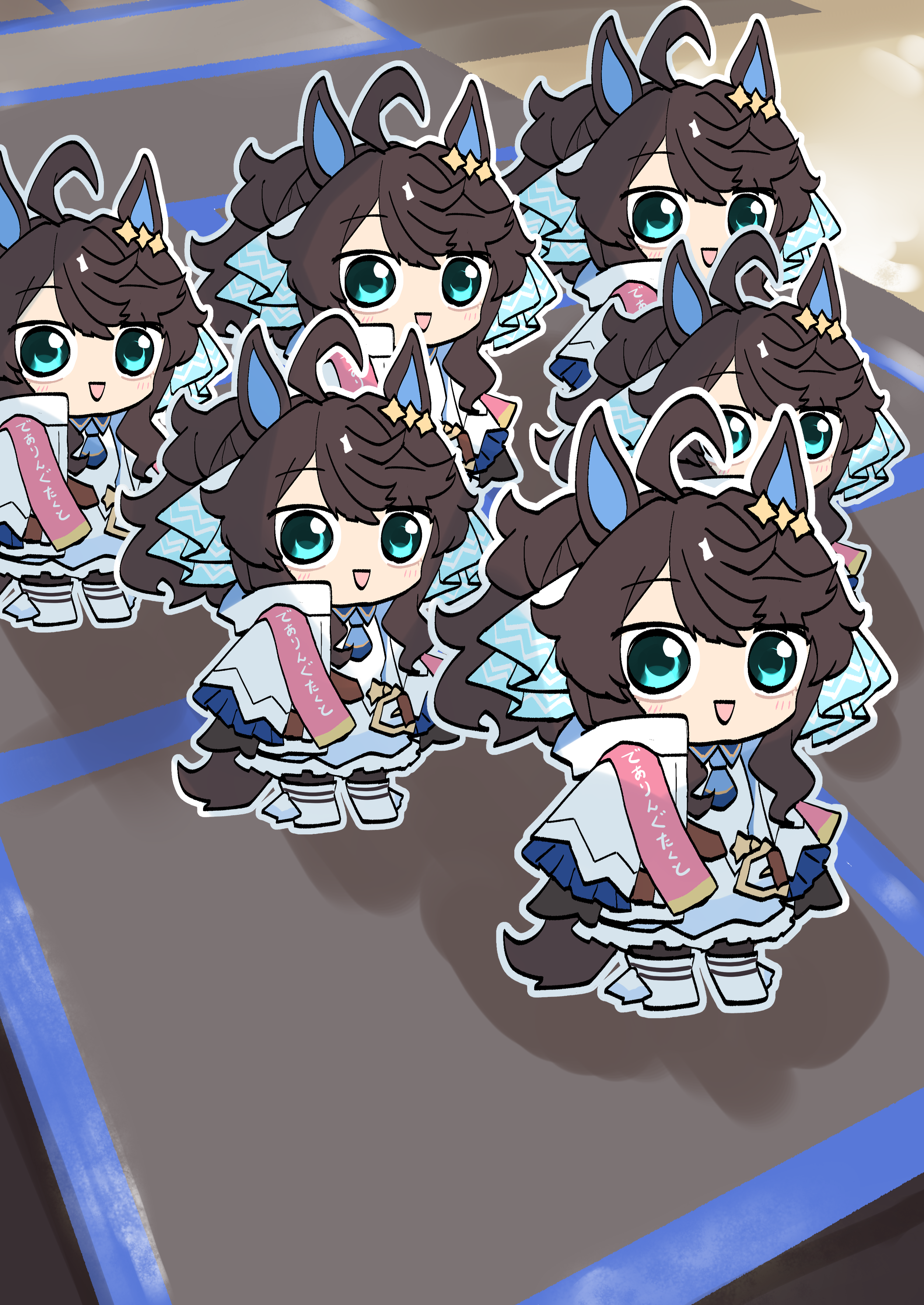 1girl absurdres ahoge black_hair blue_eyes character_doll chibi clone commentary_request daring_tact_(umamusume) doll floor full_body hair_between_eyes hair_ornament highres horse_girl looking_at_viewer muchi3333 shoes solo standing star_(symbol) star_hair_ornament umamusume