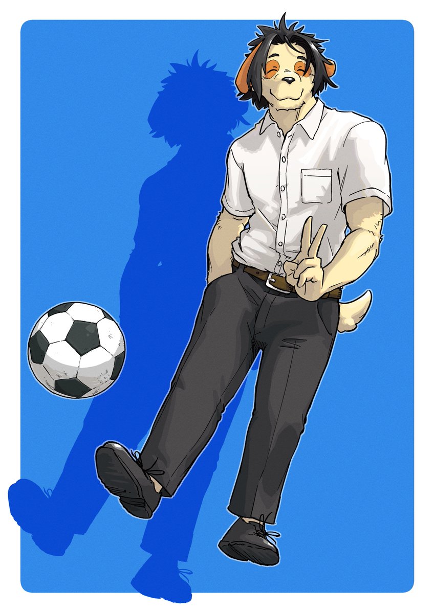 1boy animal_ears ball black_hair black_pants black_shoes blue_background closed_eyes closed_mouth commentary_request dog_boy dog_ears dog_tail facial_hair furry furry_male kyouji_takahara male_focus morenatsu pants shadow shirt shoes smile soccer_ball tail takichizento v white_shirt