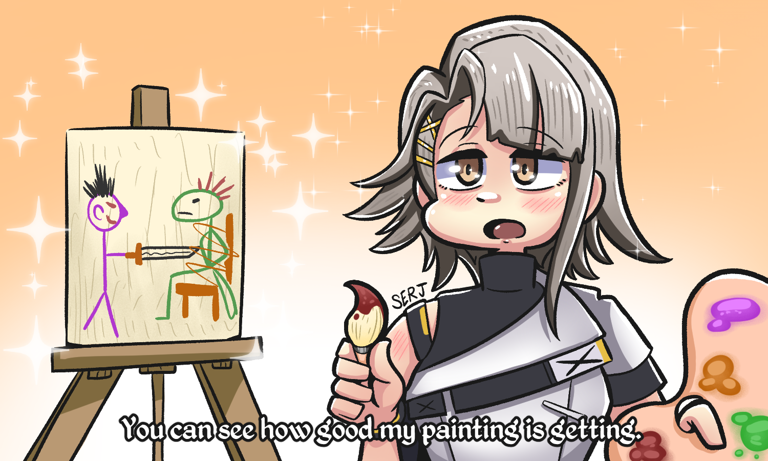 1girl artist_name asymmetrical_sleeves blush canvas_(object) commentary easel elmo_dormitory_outfit english_commentary english_text expressionless girls'_frontline grey_hair holding holding_paintbrush jitome medium_hair open_mouth paint paint_palette paintbrush serjatronic short_sleeves signature solo sparkle swept_bangs the_elder_scrolls the_elder_scrolls_iv:_oblivion upper_body vector_(girls'_frontline) wristband yellow_eyes
