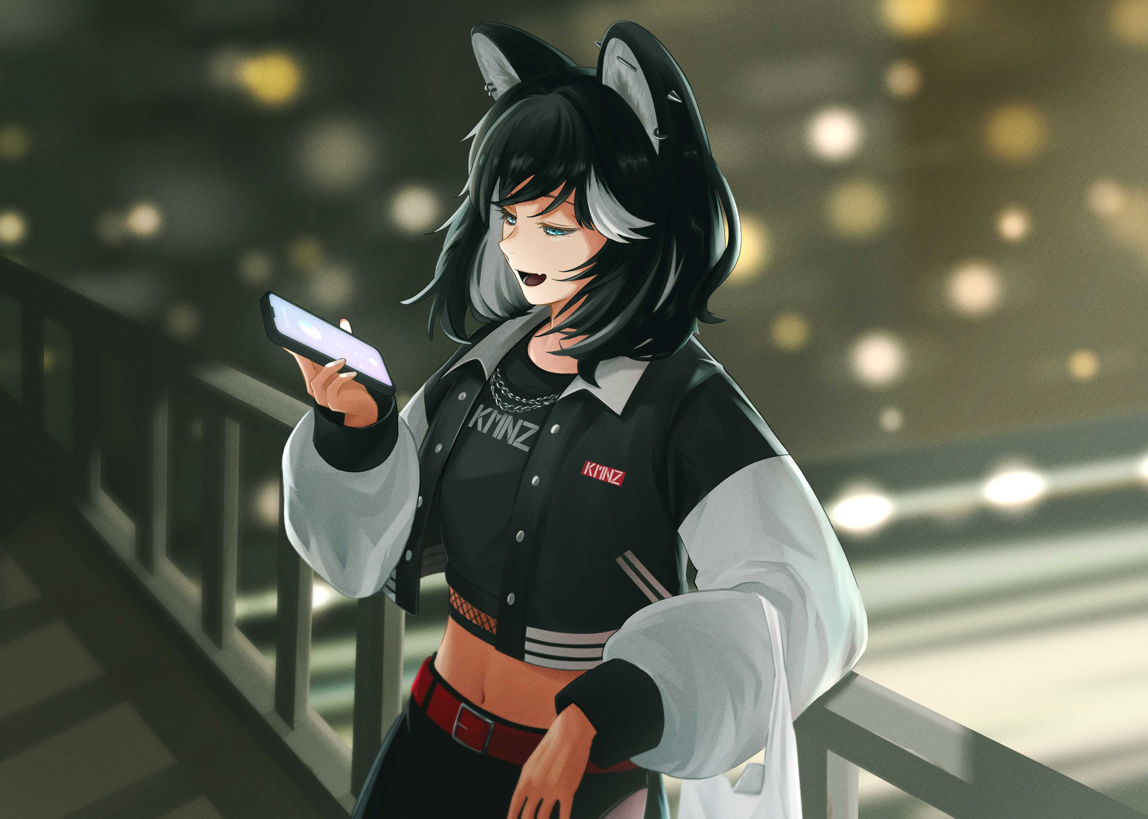 1girl absurdres animal_ear_piercing animal_ears arm_rest bag barbell_piercing belt belt_buckle black_hair black_jacket black_pants black_shirt blue_eyes blurry blurry_background buckle buttons cellphone chain clothes_writing commentary commentary_request dog_ears dog_girl ear_piercing english_commentary fang fishnet_top fishnets half-closed_eyes hand_up highres holding holding_bag holding_phone industrial_piercing itsumeee3 jacket kmnz long_sleeves looking_at_phone medium_hair midriff mixed-language_commentary multicolored_hair multicolored_jacket navel nero_(kmnz) open_clothes open_jacket open_mouth pants phone piercing plastic_bag red_belt shirt skin_fang smartphone solo streaked_hair swept_bangs two-tone_jacket virtual_youtuber white_jacket white_streaks