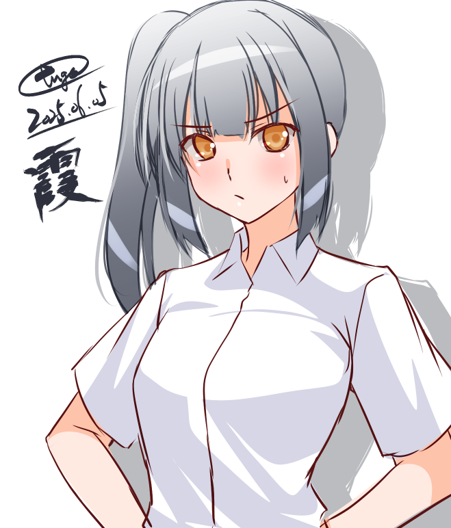 1girl alternate_costume artist_name brown_eyes character_name collared_shirt dated dress_shirt engo_(aquawatery) grey_hair hands_on_own_hips kantai_collection kasumi_(kancolle) long_hair looking_at_viewer one-hour_drawing_challenge shirt side_ponytail signature solo upper_body white_shirt