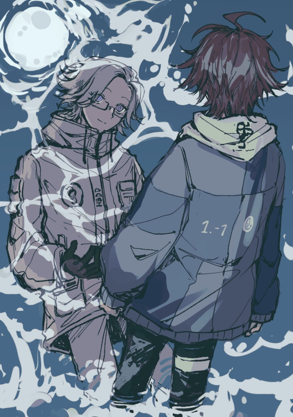 100horses 2boys ahoge aotsuki_eito black_gloves black_pants blue_jacket commentary different_reflection drawstring english_commentary from_above full_moon glasses gloves grey_hair grey_jacket highres hood hoodie jacket looking_at_another male_focus moon multicolored_jacket multiple_boys pants purple_eyes red_hair reflection reflective_liquid short_hair smile sumino_takumi the_hundred_line_-last_defense_academy- two-tone_jacket wading white_hoodie white_jacket white_pants