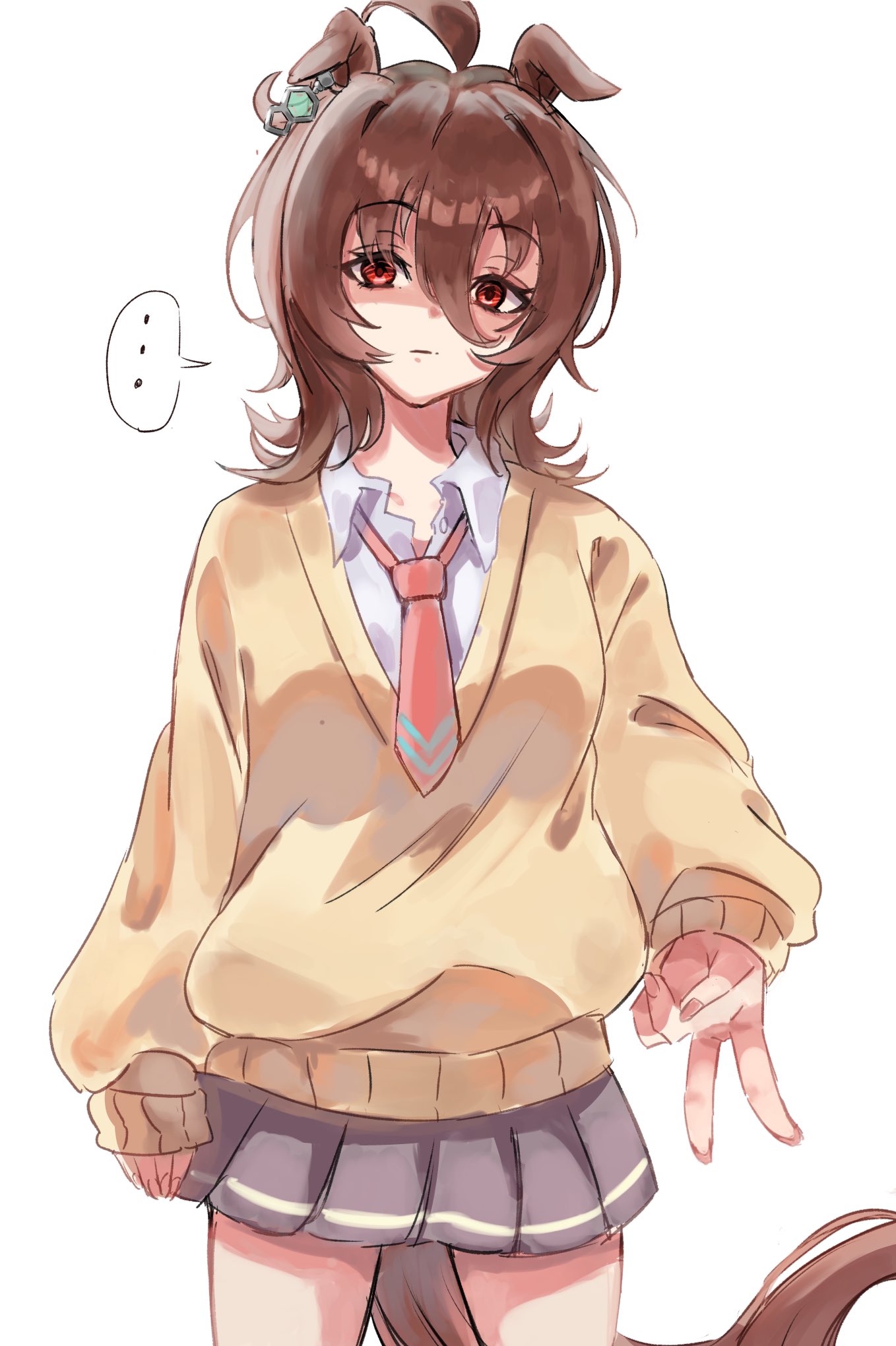 ... 1girl agnes_tachyon_(umamusume) animal_ears chemical_structure closed_mouth collared_shirt earrings ears_down grey_skirt gyaru_v highres horse_ears horse_girl horse_tail jewelry long_hair medium_hair necktie pleated_skirt shaded_face shirt short_necktie single_earring skirt solo speech_bubble spoken_ellipsis sui_sui0510 sweater tail umamusume unamused v white_shirt wolf_cut yellow_necktie yellow_sweater
